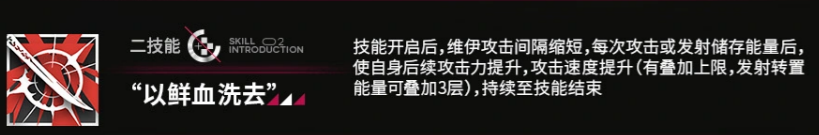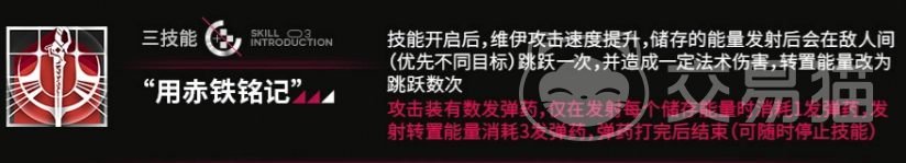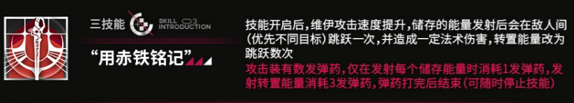 三技能「用赤铁铭记」为弹药限定型技能,共27发弹药,攻速增幅高达约200点,理论攻击间隔缩短至约1秒/次。普通储存能量发射后可在敌人间弹射1次;转置能量则具备更强扩散性,弹射次数达5次。消耗1发弹药释放1个储存能量,释放1个转置能量需消耗3发弹药。实战演示中对阵伦蒂尼姆城防自行炮与萨卡兹战士组合,群体总伤突破10万;若聚焦单体并最大化弹射路径,理论单体峰值伤害可超15万,具体数值受限于测试目标生存时长,尚待更多场景验证。