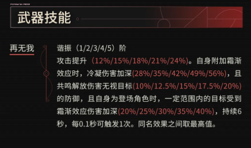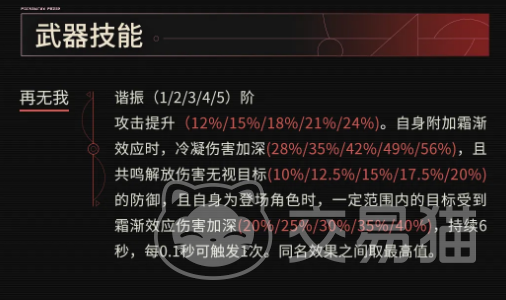 从角色适配性来看,灼霜并非泛用型武器,而是严格服务于具备高频霜渐触发能力的角色。所有被动效果均以“自身挂有霜渐”为前提,若角色技能机制无法稳定施加或维持该状态,则武器收益将大幅衰减。谐振等阶系统进一步强化其成长性:一阶即提供12%攻击力加成,升至满阶后可达24%,与角色技能循环配合后,整体输出增幅可观。