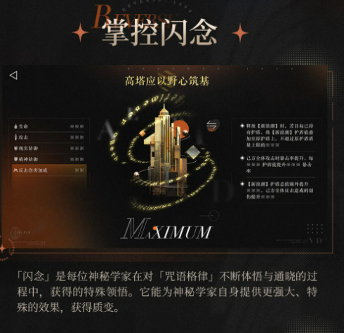 通晓至第一阶段时,将解锁核心机制——“闪念”。该机制赋予角色独特战术价值,效果具备阵营协同性与战斗策略延展性。例如:新巴别塔的闪念提供全队反击能力,并支持护盾转化为伤害及自动补充护盾;温妮弗雷德的闪念提升全队最大生命值,同步强化燃血暴击转化率与暴击率、暴击伤害;柏林以东则侧重异常作战体系,提供激情回转、异常特攻加成及仪式类减益效果额外强化。