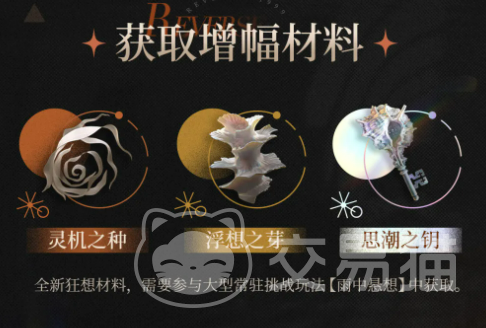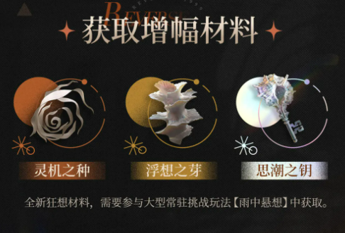支撑狂想系统运转的三类专属材料为:灵机之种、浮想之芽、思潮之钥。获取途径为常驻高难度挑战副本——“雨中悬想”。该副本开放门槛与狂想系统一致:6星角色需洞悉III达30级,5星角色需洞悉III 1级,且主线同样须通关至“5TH.20 探寻者”。