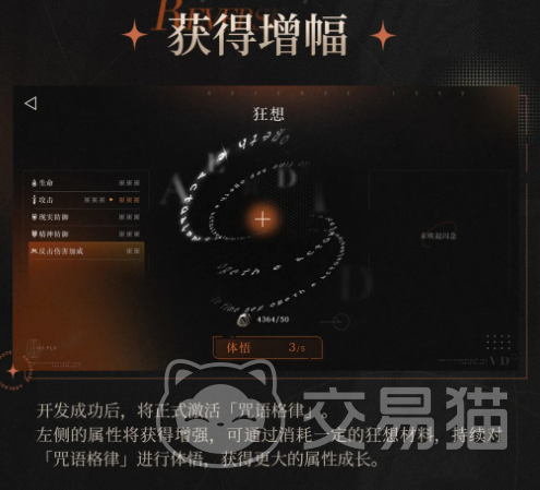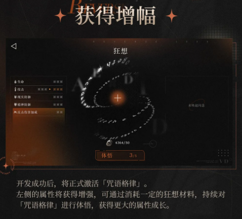 系统流程分为三阶段:首阶段为“开发”,消耗专属材料激活初始咒语格律,即时提升基础属性;第二阶段为“体悟”,持续投入资源提升当前格律层级,扩大属性增幅幅度;第三阶段为“通晓”,达成体悟上限后触发质变,格律升阶,不仅原有加成进一步增强,还将解锁新增属性项。每完成一次通晓,即迈入更高阶的成长周期。