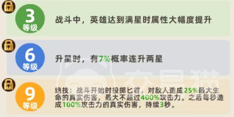 当花木兰达成满星(即6星)后,光环效果强化至40%移速与30%攻速加成,团队协同能力进一步跃升。等级成长方面,9级是其质变节点:此时解锁主动技能“飞刃突袭”,可在战斗起手瞬间向敌方投掷匕首,造成相当于目标最大生命值25%的真实伤害;随后每3秒自动触发一次等同于100%攻击力的真实伤害,持续生效。需注意该持续伤害设有上限,单次总伤不可超过花木兰自身攻击力的400%,以保障游戏数值平衡性。
