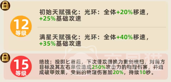 升至12级时,天赋光环再次升级:基础形态下移速加成提升至20/200(即20%),攻速加成增至25%;满星状态下则分别达到40%移速与35%攻速。而当角色达到15级,技能机制迎来关键进化——首次释放“飞刃突袭”后,下一次普攻将自动转化为“重剑横扫”,对前方及左右相邻单位造成250%攻击力的物理伤害,并附加持续10秒的破甲效果,使目标受到的物理伤害提高20%。该机制极大提升了对敌方前排的压制力,是突破高防阵容的核心手段。
