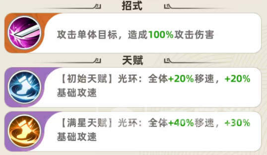 花木兰的核心优势首先体现在生存能力上:基础生命值高达1100点,在前期战士中属顶尖水平。配合自身较快的基础攻速,可稳定触发全额普攻伤害。更值得关注的是其天赋光环机制——未升星状态下,即可为全队提供20%移速与20%攻速双重增益。该效果同步提升机动性与输出节奏,使我方单位能更快切入战场、更频繁地完成攻击循环,显著优化整体作战效率。