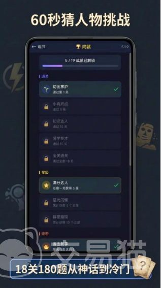 游戏内置结构化闯关体系:基础模式设18个主题章节,共180道原创题库,涵盖历史人物、影视角色、文学形象、科学巨匠、体育明星等多元领域,难度梯度平滑递进;通关全部章节可获得专属成就徽章。限时冲刺模式强化节奏感,要求玩家在60秒内完成尽可能多的连续作答,命中连击将触发积分倍率提升,考验反应速度与知识广度的双重能力。