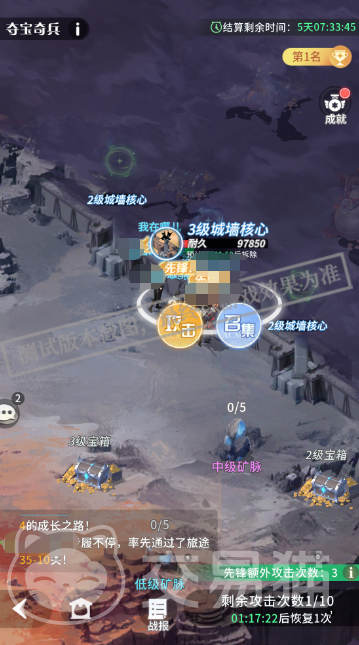 玩法涉及三大核心资源:战符用于发起PVP攻击,每日5:00自动回满,亦可消耗星钻补充;命能代表角色生存能力,战斗后按存活英雄数量与剩余血量比例扣除,归零即被强制传送回星落营地,营地内可自然恢复,或使用生命药水/星钻加速恢复(生命药水在活动期间自动缓慢充能,无需额外购买);功勋值则决定公会最终排名,来源包括挂机勘探(依矿脉品质加成)与战斗贡献(按敌我双方命能损耗及战力系数计算),单纯挂机无法替代必要对抗。