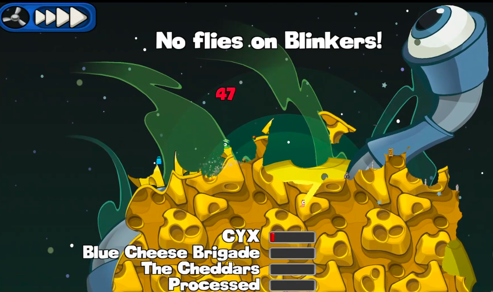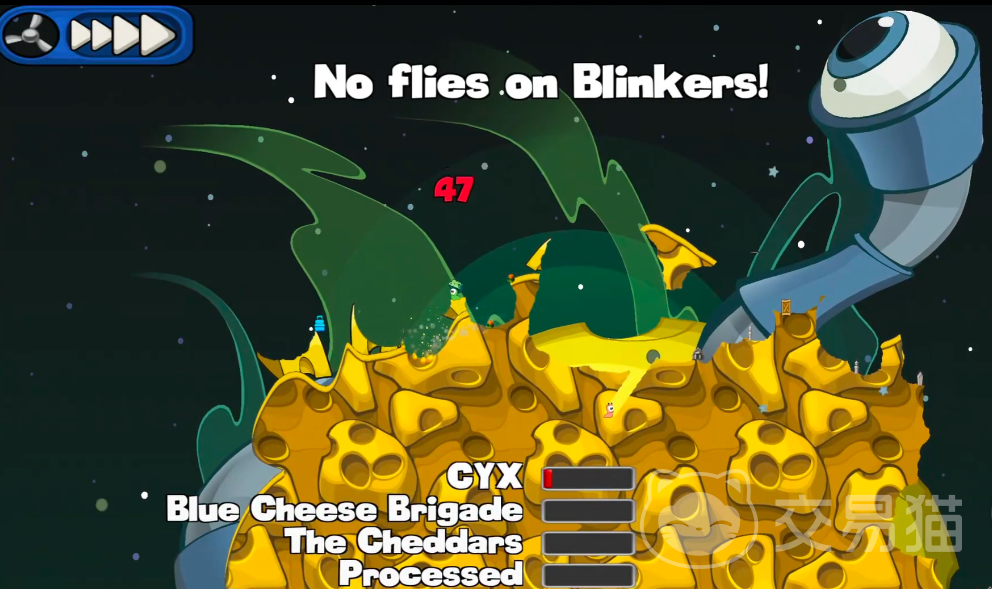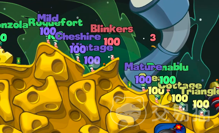 第30关设定了明确的装备限制:钻头被完全禁用,不可用于地形穿透或快速接近目标。玩家可调用的可用道具仅限于绳索、火箭筒、球棒及神圣手雷四类。关卡地形以可啃食的奶酪结构为主体,虫子可通过持续啃咬逐步向下挖掘,构建通路;但需高度警惕地图上方持续巡弋的“巨大天眼”——其具备实时追踪能力,会对暴露在地表的单位发动精准打击。因此,优先使用火箭筒瞄准天眼头部进行压制性输出,是保障后续推进安全的前提。