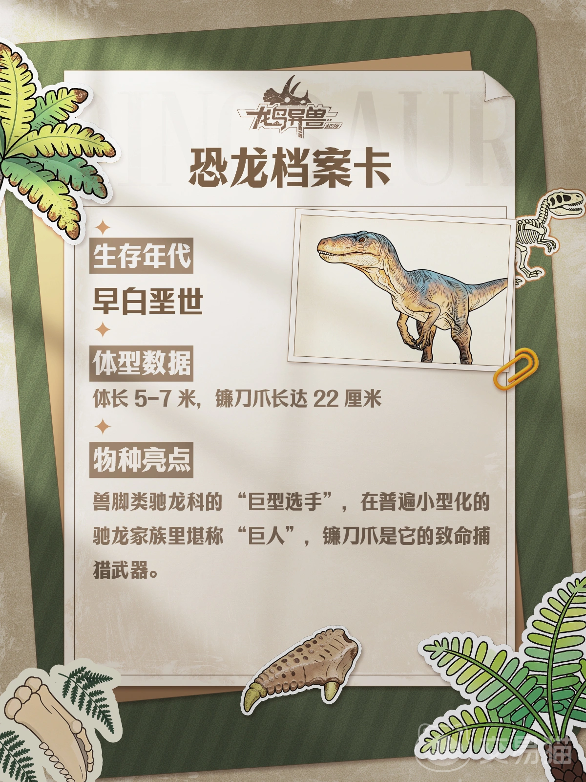 犹他盗龙在设定中体长稳定维持在5至7米区间,是目前已知驰龙科中体型最庞大的成员之一。其前肢演化出长达22厘米的巨型镰状趾爪,配合强健的后肢肌群与灵活的脊柱结构,使其在近身缠斗中兼具爆发力、精准度与持续压制能力。游戏内将其定位为高机动型近战输出单位,技能设计围绕“撕咬控制—状态净化—连击续航—全技重置”四大逻辑展开,形成完整闭环战斗体系。
