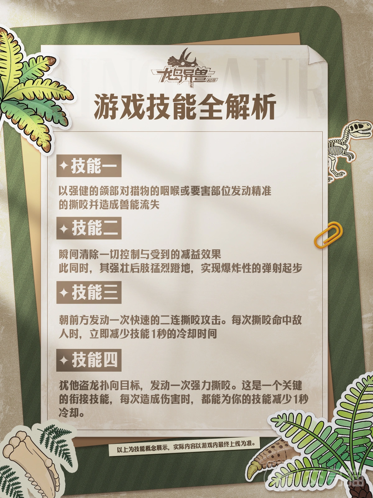 综合来看,犹他盗龙在《龙岛异兽起源》全恐龙图鉴中属于攻守兼备的高阶战力单位,技能组合覆盖输出、解控、续航与节奏掌控四大维度。但需注意的是,其高爆发特性依赖近身环境,在面对具备多重远程控制链(如群体禁锢、长时沉默)的对手时,操作空间与容错率会受到明显限制,需配合地形与队友协同弥补短板。