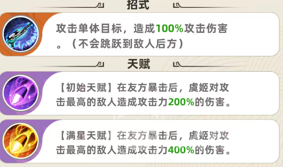 虞姬的基础攻速与初始攻击力均处于T0梯队,面板攻击值达84点。其普攻为固定单体锁定机制,不位移、不跳劈,全程维持原始站位进行100%基础伤害结算,规避了反伤类敌人带来的生存风险。核心爆发逻辑依托于队友暴击——当任意友方单位触发暴击后,虞姬将立即对敌方当前攻击力最高的目标发动强化打击:初始天赋下造成200%攻击力的额外伤害;满星状态下该数值提升至400%,即等效于三倍基础攻击输出。