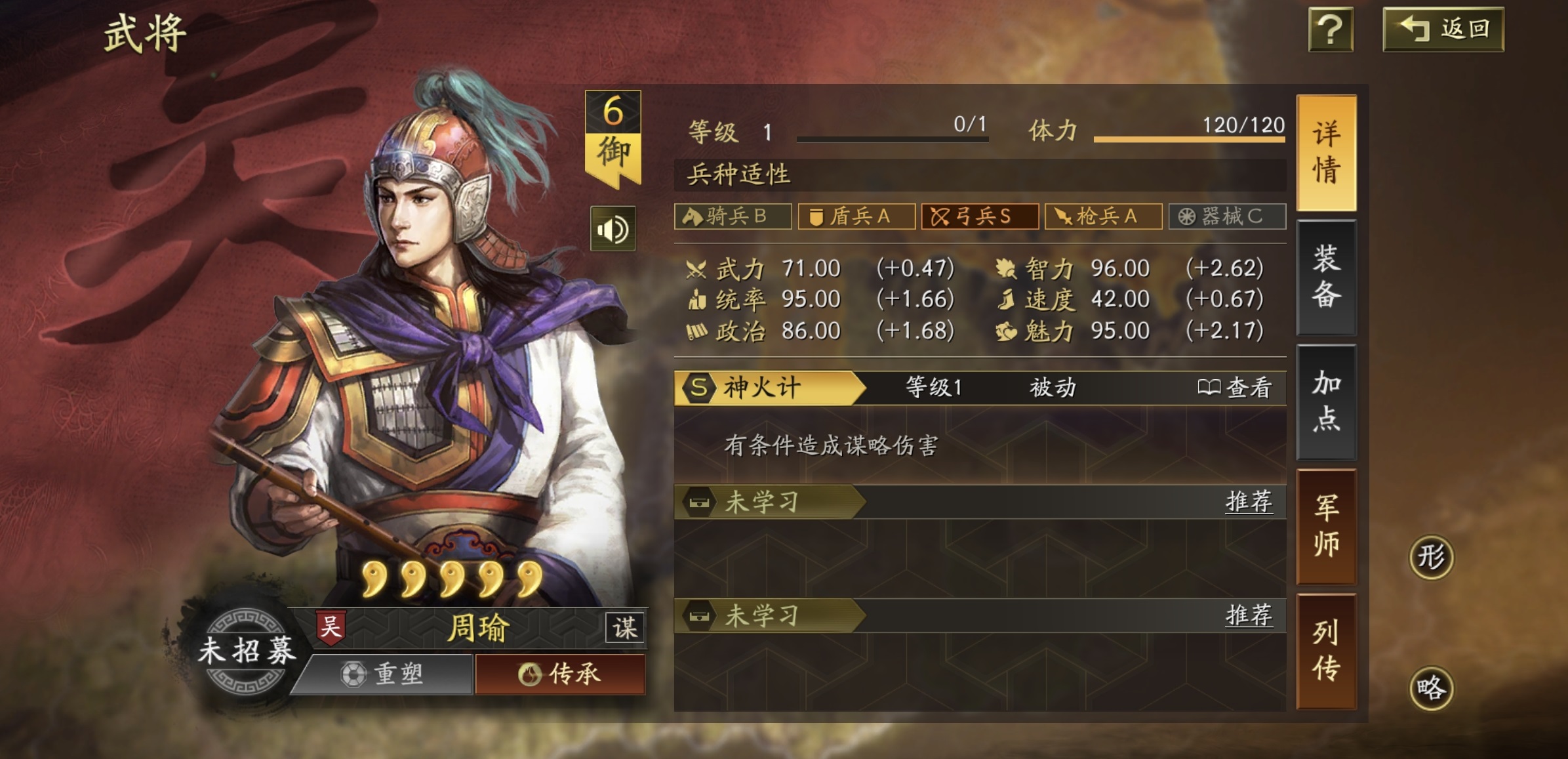 从武将定位来看,陆逊属于S级弓兵,自带战法【火烧连营】可触发持续灼烧伤害,并附带全体谋略加成与震慑效果,兼具输出、增益与控场三重价值。其技能机制天然适配火攻体系,在队伍中通常承担主C职责。在实际养成过程中,推荐全程智力加点,以最大化谋略伤害与战法发动率。搭配太平道法与士别三日,可显著提升爆发稳定性与生存容错率。