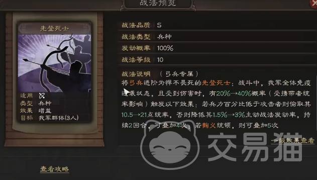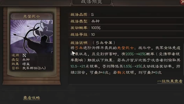 在《三国志战略版》中,战法搭配、兵种特性与阵容构建是影响战斗胜负的关键要素。作为S级弓兵兵种,“先登死士”凭借其独特的机制设计,在高阶对战与主流配队中持续保持高人气。本文将围绕该兵种的核心机制、实战定位及战术价值展开解析,帮助玩家深入理解其不可替代的战略意义。