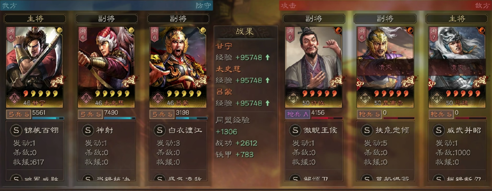 该阵容的设计出发点在于形成“爆发—连击—控制”三位一体的节奏闭环:甘宁依靠自带战法【会心一击】提供高额暴击率,配合普攻高频触发伤害;太史慈以稳定连击能力衔接突击类战法,强化输出持续性;吕蒙则承担前排干扰与战术压制职能,通过缴械效果限制敌方关键武将行动。整体定位为高速压制型弓兵队,兼具前三回合爆发力与中后期控场韧性,在对抗SP马超等依赖多段突击的阵容时尤为高效,常能实现低损高战功的压制效果。