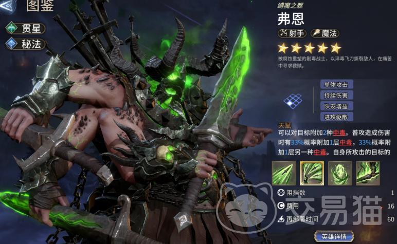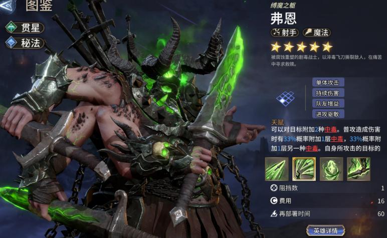 弗恩:战术执行中枢。其普攻与技能均可稳定施加两种独立中毒状态,大招不仅造成多段伤害,更可重复附加中毒层数。配合被动提供的“护盾增伤”,在工会龙8等护盾型Boss战中表现优异。此外,大招附带的进攻性驱散效果,使其成为泰坦废墟第二阶段的关键破局手。