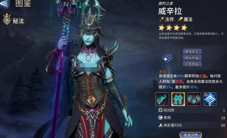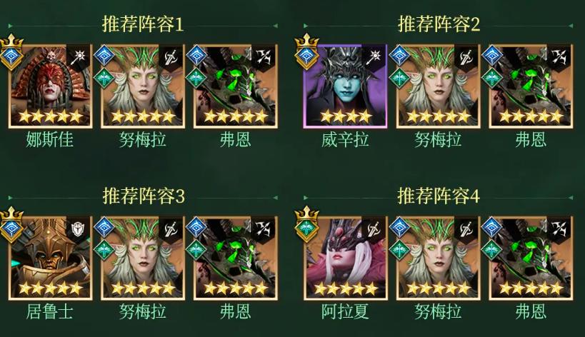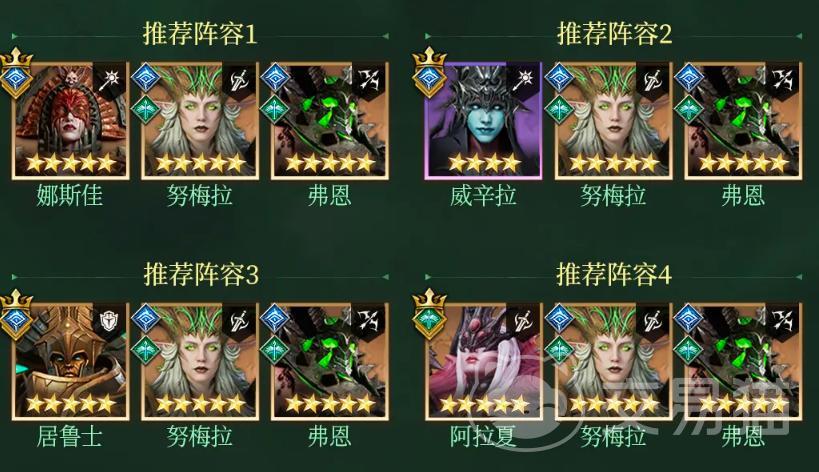 中毒流派遵循清晰的三阶递进流程:“挂毒→深化→引爆”。前期由弗恩与娜斯佳快速铺叠中毒层数并强化效果;中期通过娜斯佳增益与弗恩持续补毒维持层数密度;后期由努梅拉集中引爆,实现伤害峰值输出。标准配置即娜斯佳+弗恩+努梅拉,三者技能链高度契合。若暂未获取娜斯佳,可选用四星领主威辛拉作为替代方案——虽无直接增伤技能,但其技能可降低全队技能消耗并附加中毒,仍能有效支撑努梅拉的毒爆伤害转化。