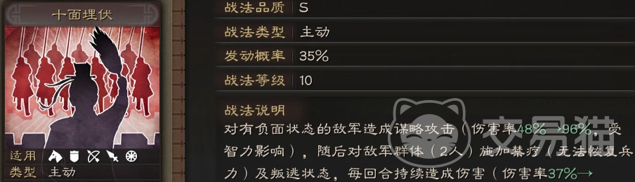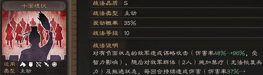 历史设定中,程昱位列“三大毒士”,以谋略深沉、手段果决著称。其专属战法“十面埋伏”源自仓亭之战典故,战法品质为S级,属主动型技能,基础发动概率35%。该战法对已携带负面状态的敌军单体发动谋略攻击,伤害率区间为48%-96%,受智力属性加成;命中后,额外对敌军两人施加禁疗与叛逃状态,并触发持续两回合的真实伤害,该伤害量取决于使用者武力与智力中的较高一项,且完全无视目标防御属性。综合来看,“十面埋伏”的实战覆盖率与战术功能性均处于当前版本第一梯队。