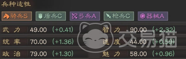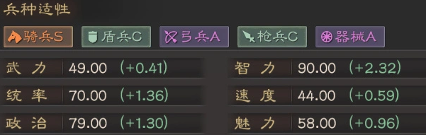 兵种适性方面,程昱骑兵适性为S级,弓兵与器械均为A级,盾兵与枪兵则为C级,凸显其高速突进、侧翼压制的战术倾向。基础属性中,智力高达90,武力仅为49,统率与政治数值亦属中上水平,但速度成长偏低,客观上更适合作为后手输出角色部署,而非首发突击单位。