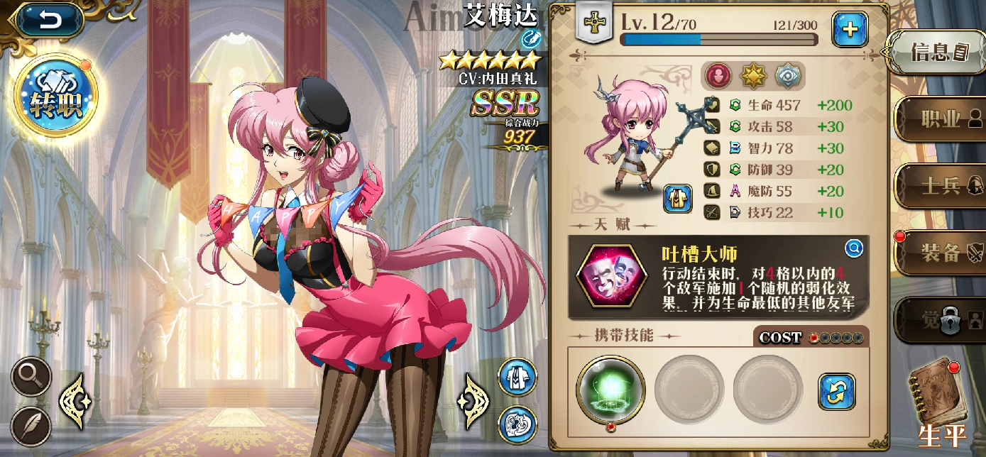 三小强中唯一的女性角色,兼具功能性与人气。天赋技可在3格范围内对单个敌方单位施加减益状态,同时为生命值最低的友方单位恢复生命,兼具干扰与续航能力。转职后技能组进一步拓展,既能提供群体治疗,亦可衔接中距离法术输出,是前期推图与竞技场中不可替代的多功能辅助。养成门槛低、上线即用,建议新手阶段优先升至满星以激活完整机制。