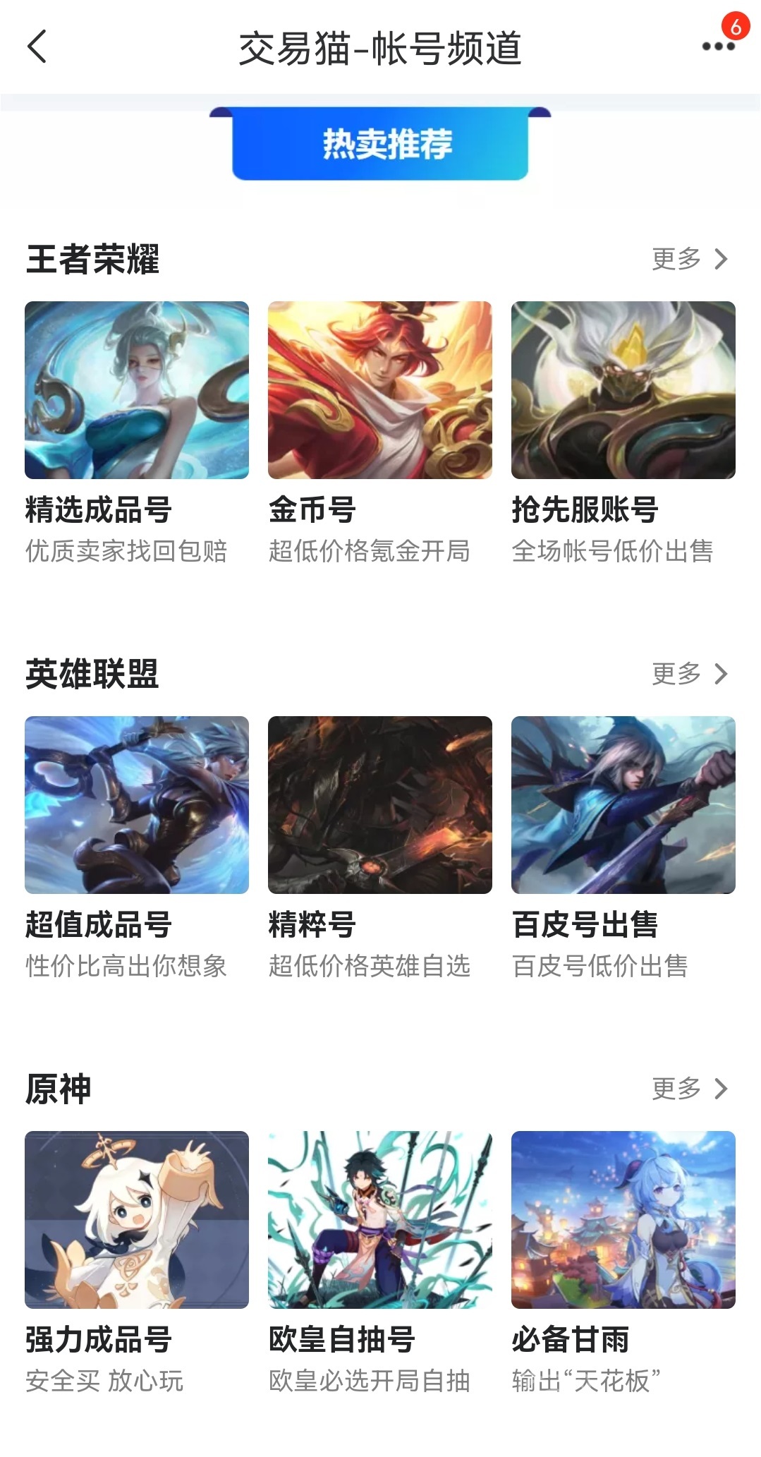 在交易猫中不仅有成品账号的交易专区,还提供了开局号、首充号等账号类型,以及游戏内道具的交易。不仅买家拥有了更多的选择,卖家也可以通过丰富的交易途径获得更好的收益。其中开局号和首充号可以批量进行交易物美价廉,适合喜欢体验新区的玩家。