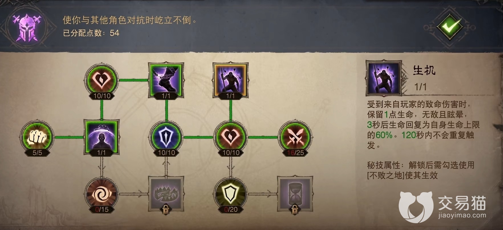 第3套是不败之地,适合喜欢进行pvp的玩家,这一套中拥有免控、受控缩减和生机这三个秘技,具体点发是先从破甲开始,往上点出生机,最后将伤害点满。生机可以在受到致命伤害时,保留一点生命值,在短暂的时间内将会无敌,并且后续持续恢复血量。受控缩减的效果是降低受到控制时的持续时间,在PK中短短的几秒钟就能起到决定性的效果。