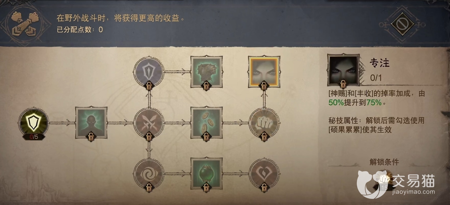 第2套是硕果累累,这一套天赋适用于在野外战斗,因为有了苦练、神赐和点金三个秘技,所以在击杀精英怪能够获取高收益,无论是经验还是掉落魔法装备的概率都大大提高。具体的点法是从护甲开始,先往上点出神赐,然后往右点一直到点出专注就可以了,一共需要54点天赋点数。