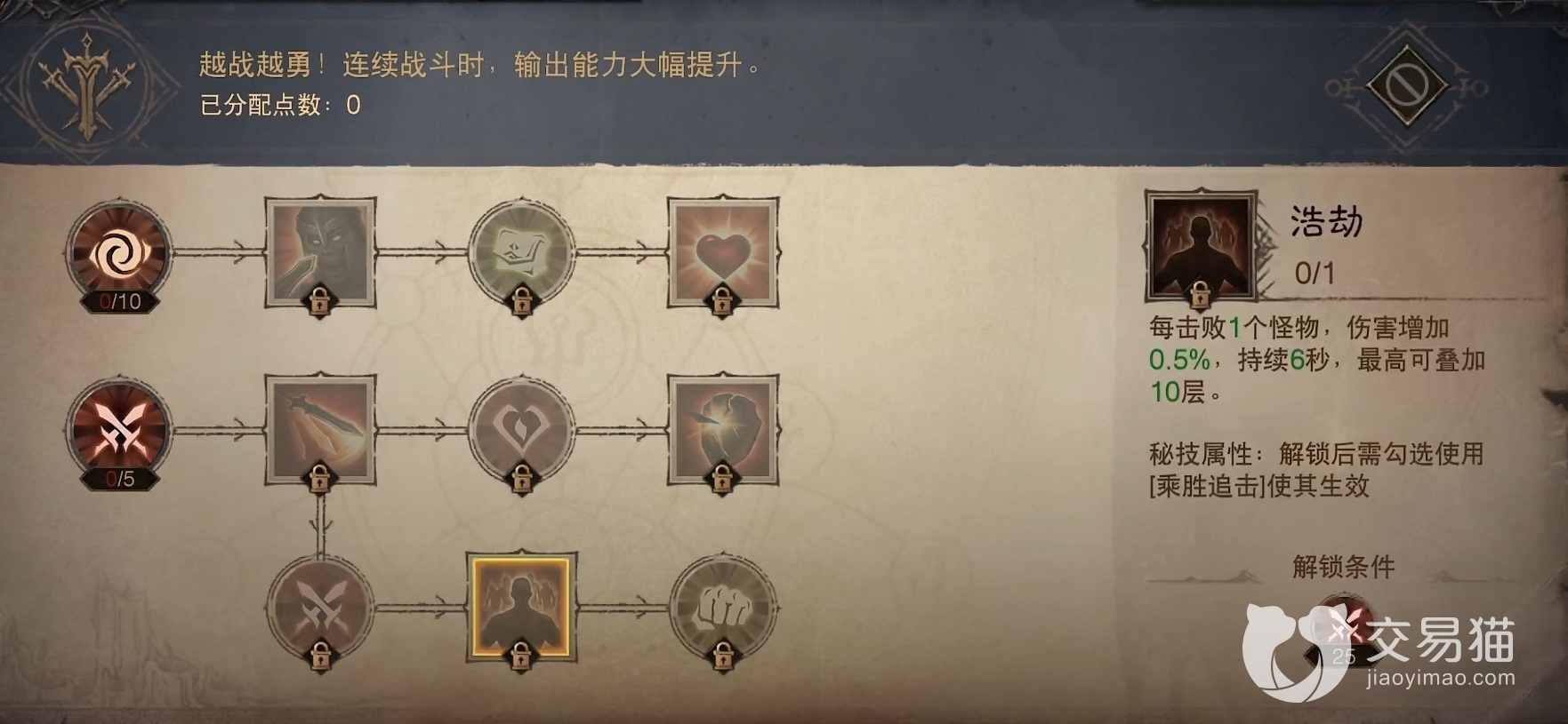小编将会推荐三套不同的天赋,以应用于不同的战斗场景,第1套是乘胜追击,这一套天赋适用于在pve中面对大群怪物时能够起到很好的效果。具体的点法就是从伤害开始,然后一直点到最后的破甲,需要57点天赋点数。其中的狂热每击败一个怪物就可以叠加急速,浩劫可以击败怪物叠加伤害,这两个秘技叠加起来到持续输出非常恐怖。