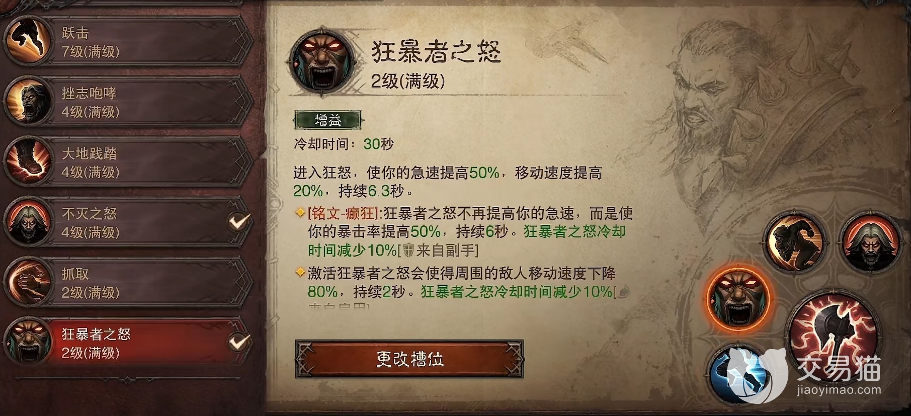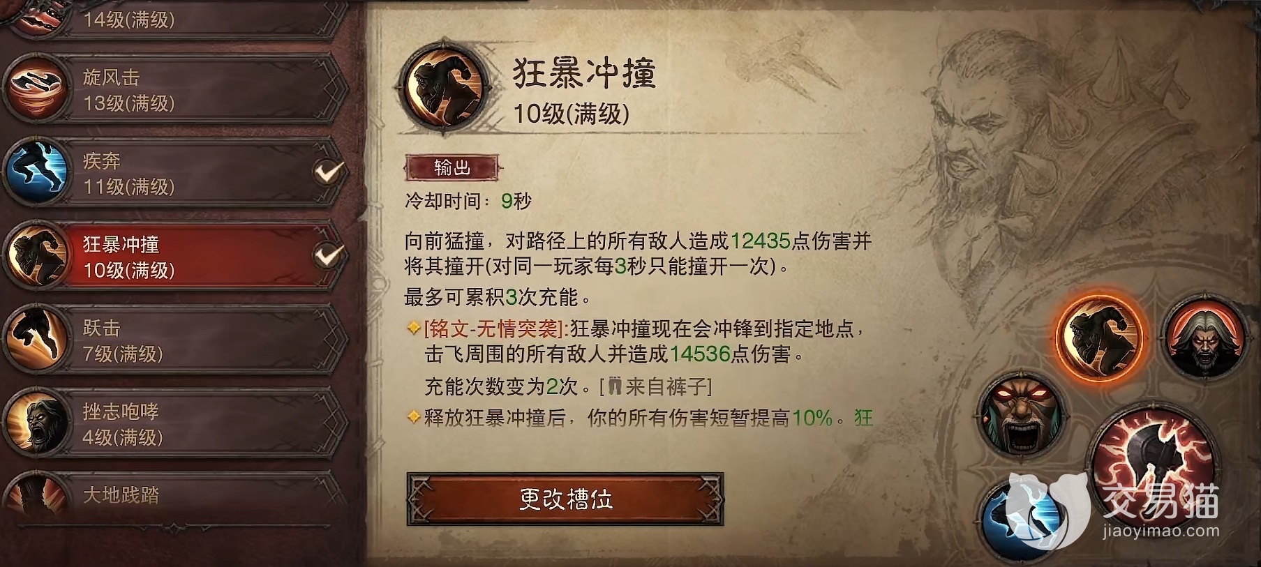 第三个技能选择狂暴冲撞,可以朝着前方猛烈冲撞,能够累积三次充能,是野蛮人重要的位移和控制技能,铭文选择无情突袭,效果变为朝指定方向冲锋并且击飞和击伤敌人。最后一个技能选择不灭之怒,在技能持续时间内野蛮人受到伤害不会死亡,而是维持一点生命值,并且获得高额的吸血效果。此技能堪称是野蛮人PK时保命神技,经常能创造奇迹。