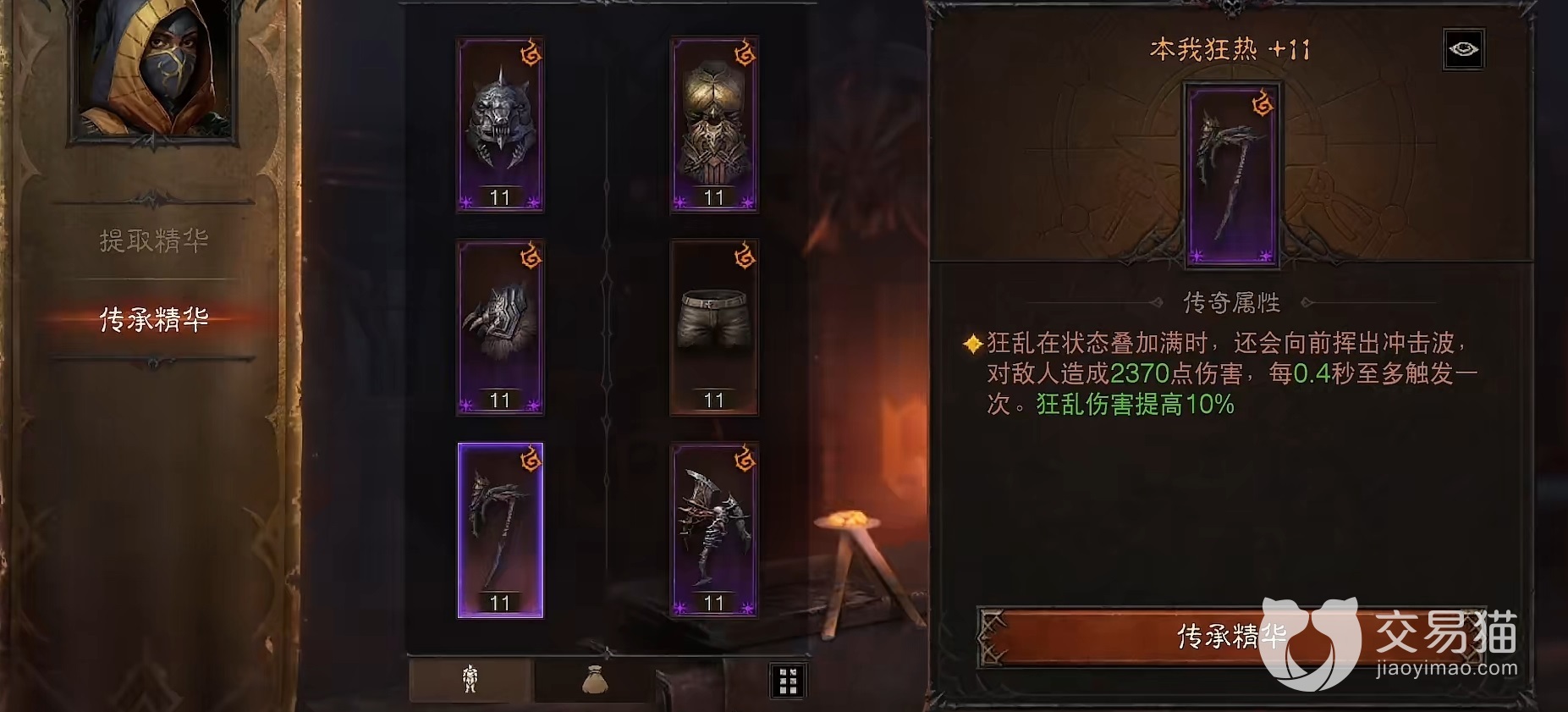 在传奇特效方面,武器选择本我狂热,能够最大限度提高狂乱的输出,因为在本套玩法中狂乱才是输出主要来源。副手武器选择破碎之魂,能够提高瞬间爆发能力,肩膀选择怯懦者之灾,在激活不灭者之怒时,能够降低周围敌人的移动速度,对付远程职业尤其好用。裤子选择愤怒尖啸,衣服选择追捕者之怒,效果是在释放冲撞之后提高造成伤害。头盔选择复苏之息,可以提高疾奔效果持续时间,更好的去追击敌人。