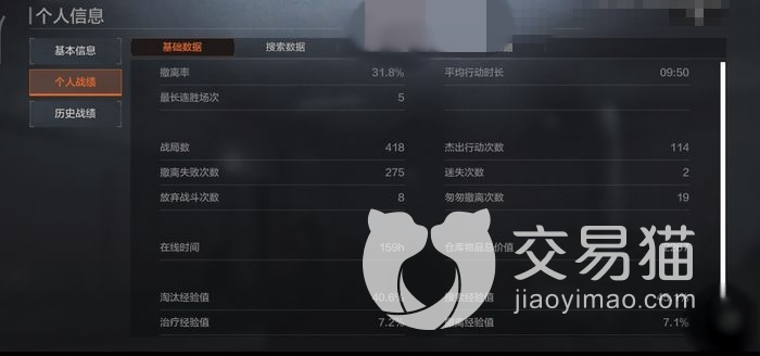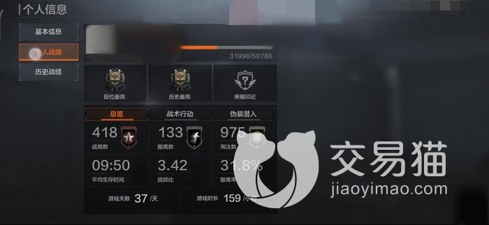 基本信息就是可以看到当前和历史最高段位,以及历史上的印记荣誉,总览选项就是战斗的局数分为淘汰以及安全撤离的数量,当然在该游戏中安全撤离的数量越多就认为胜率越高,并且还会统计玩家的平均生存时间以及战损比,撤离概率。而游玩天数以及游戏时间也当然包括在其中。