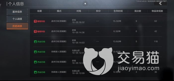 如果大家想要每一局的战绩的话,每次淘汰或安全撤离过后大家大家都会显示,大家可以清楚的看到自己的单局战绩以及优秀表现。想要看总的表现和历来表现,需要在角色选择界面,点击角色选择界面,左上角可以很直观的找到个人信息选项,点击进入,之后总共会有三栏选项,基本信息选项,选项以及历史战绩选项。