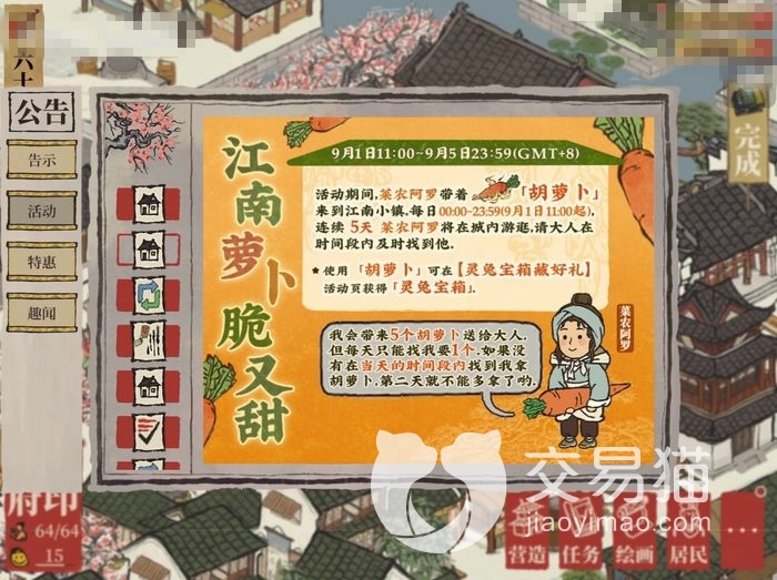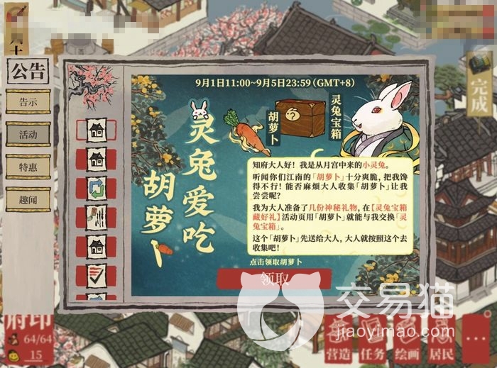 中秋是吃月饼阖家团圆的季节所以少不了月亮,与月亮相关的嫦娥月兔也会降临江南百景图的世界,月兔作为特殊npc会给玩家带来胡萝卜,打开公告可以领取一个,之后就需要找送胡萝卜的老农领取每天数量有限,胡萝卜可以换取月兔宝箱,每个里面都有好礼甚至还有抽奖的金画轴。