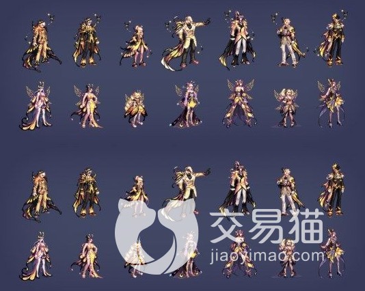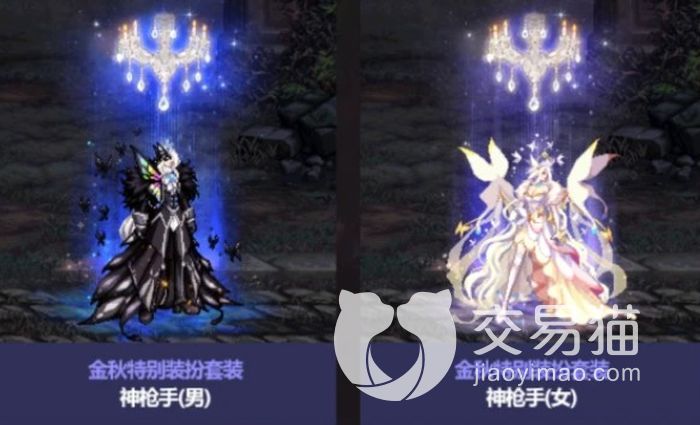 枪手套装的名字是金秋特别装扮,男枪手是黑色的礼服,高贵大气,背后还跟了很多黑色的蝴蝶,头顶还有一个奢侈的灯,带着蓝色的光效。女抢手的套装是月亮那种黄色,淡淡的,看起来很温柔身边围绕着很多黄色的蝴蝶,头顶有着和男抢手一样的灯,周围光效是紫色的。