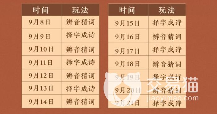 这个桂月诗宴有两个玩法,为了中秋节准备的当然和中秋节有关系啦。游戏也两种玩法,应该是辨音猜词,还有一个是择字成诗。这两种个玩法是都是在中秋活动时间内可以玩的。不过具体是辨音猜词和择字成诗两种玩法一天一个轮流着来的。