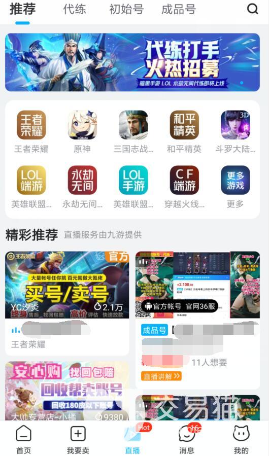 2、除了最基本的各种账号出售功能以外,玩家们还可以在交易猫app当中在线观看直播。而直播的内容也主要以向玩家们推荐各种游戏账号、道具交易信息为主。这一独特的功能,将帮助各位玩家更直观的去了解不同商品的具体信息。