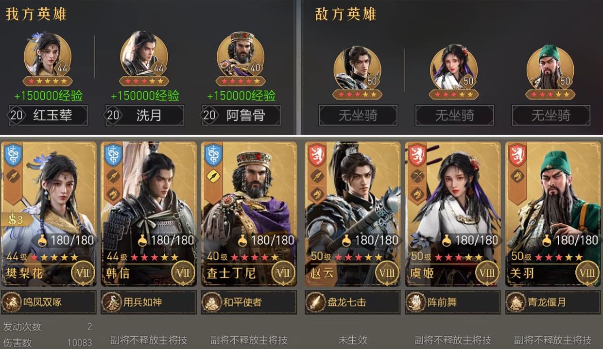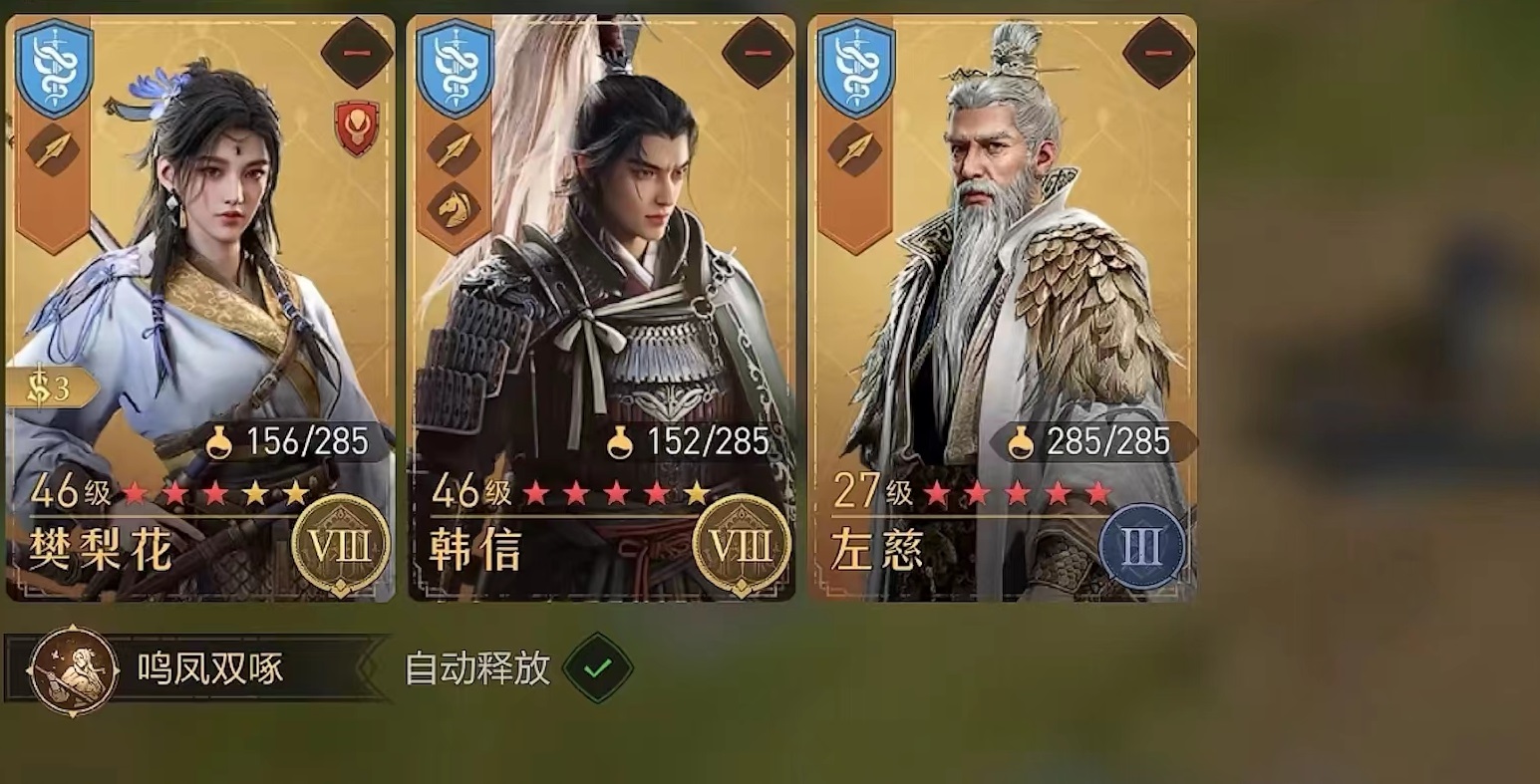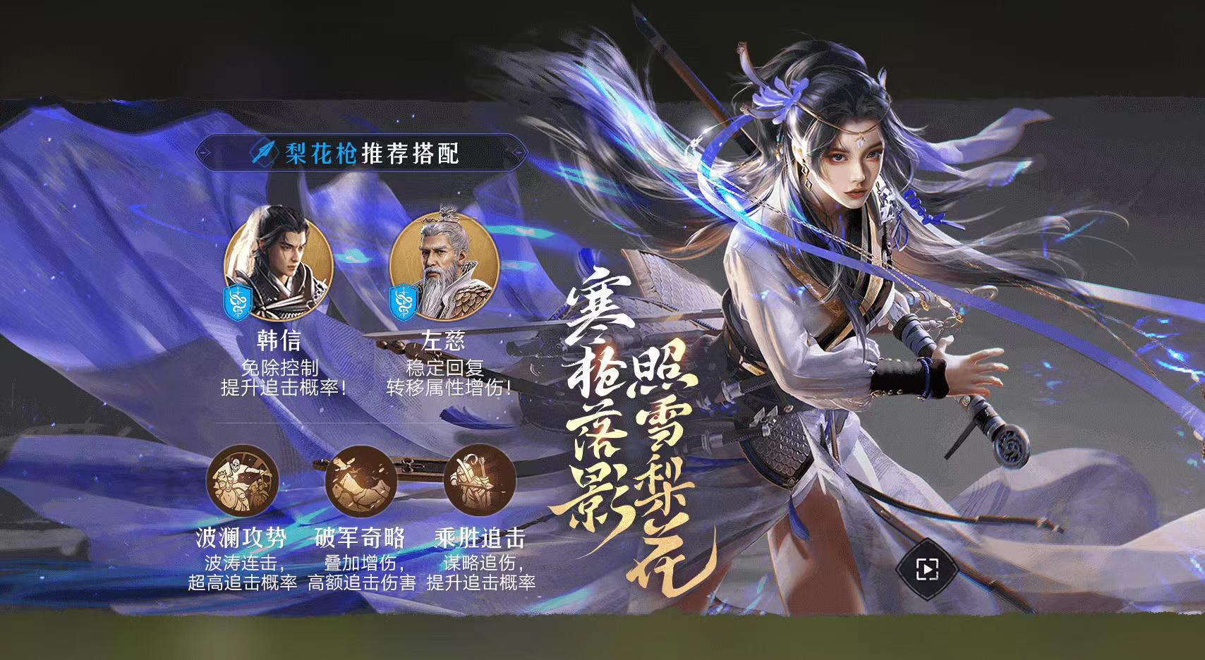 樊梨花和韩信加上左慈,这一套组合应该是目前公认最适合樊梨花的搭配,目前左慈在治疗界非常强势,并且能够将属性传递给樊梨花,这样樊梨花的输出可以得到进一步提高。樊梨花技能搭配破军是因为它是目前谋略追击伤害中最高的一个,可以说是为樊梨花量身定做。而韩信则是能够提供追击概率加成和免除控制,在和左慈搭配之下,让樊梨花充分发挥出核心的作用。