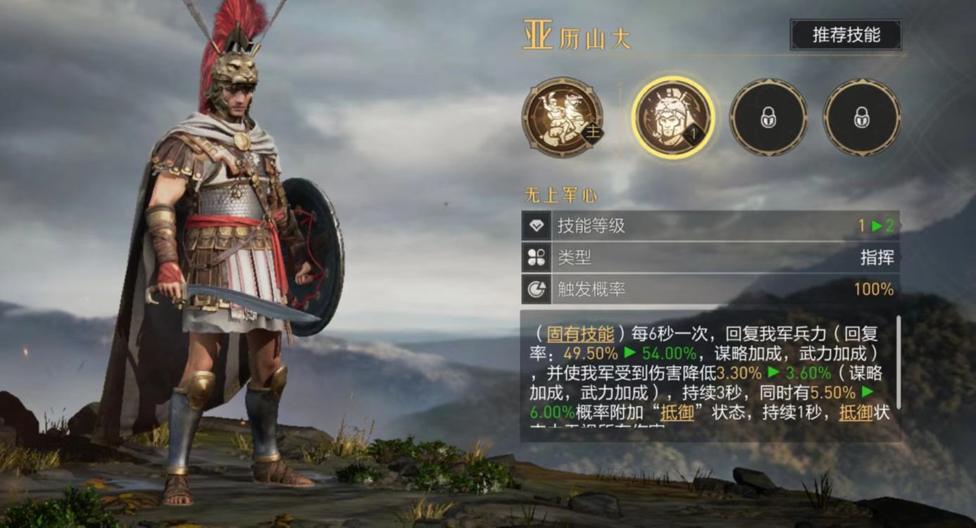 最后一套是将亚历山大换成查士丁尼,优势在于比左慈多了一个技能格子。胜利代价提供一些增伤,选择其他的回复或提高追击的技能同样可以。这一套阵容最大的优势可以在枪兵和骑兵之间自由转换,能够根据需要随时选择。