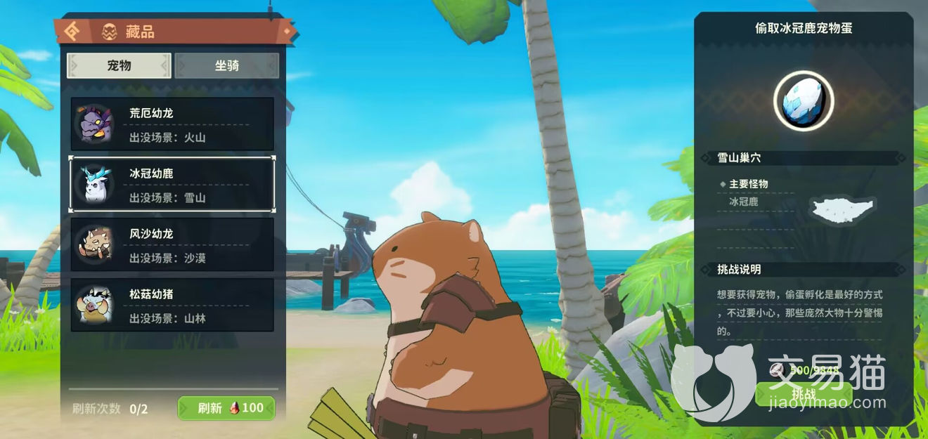 游戏设定是每天会有4个头宠物蛋的挑战,宠物蛋会从猎人已经解锁的怪物图鉴里面随机进行抽取,开始挑战的时候需要消耗500石币,建议开始挑战之前先吃个体力饭补充体力,做好准备之后直接对话土拨鼠就能够选择想要获取的宠物前往固定的场景进行挑战了。