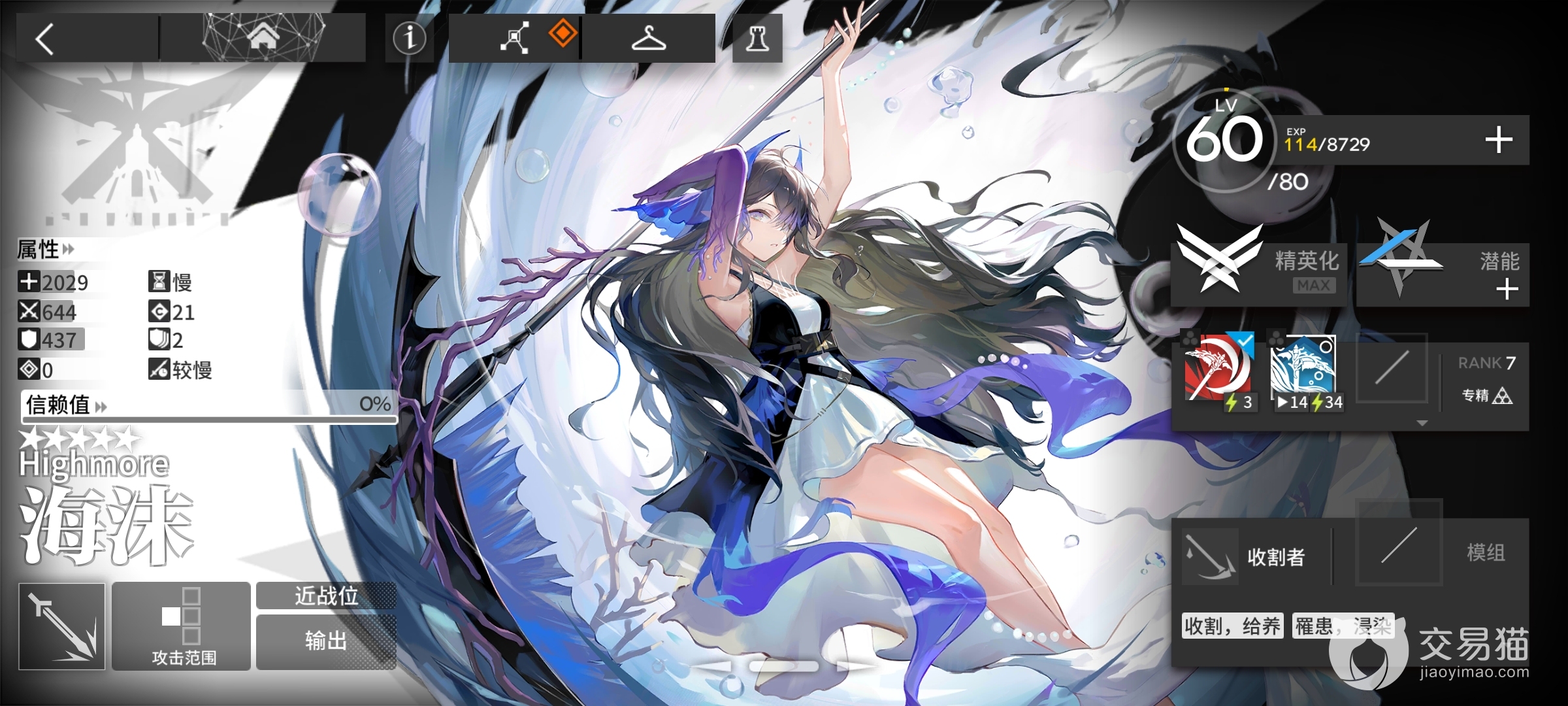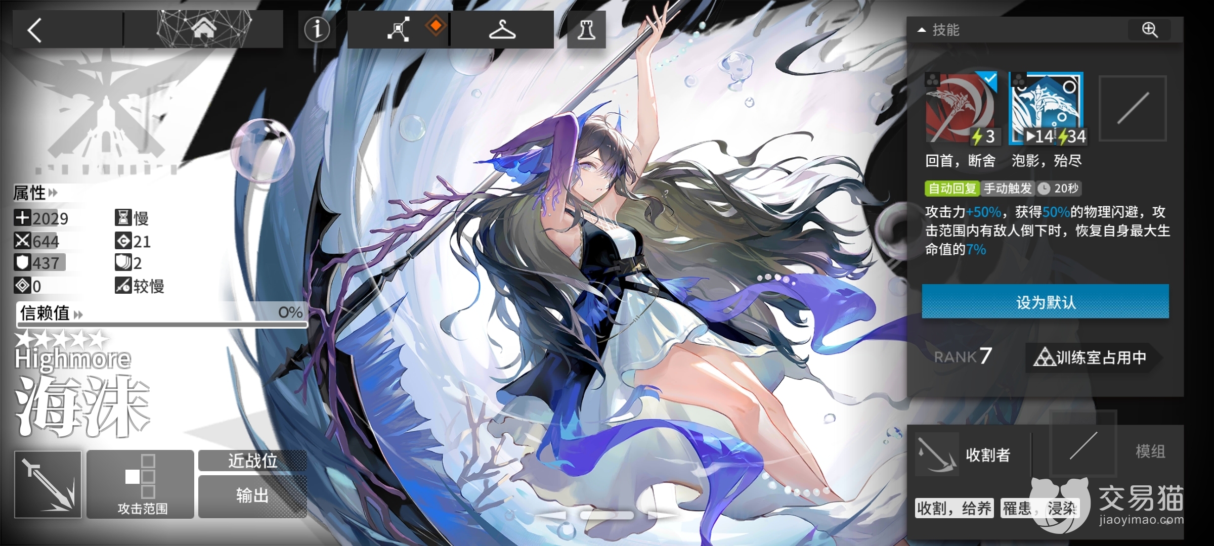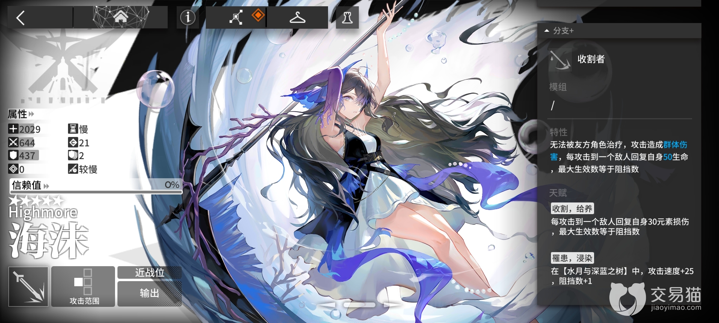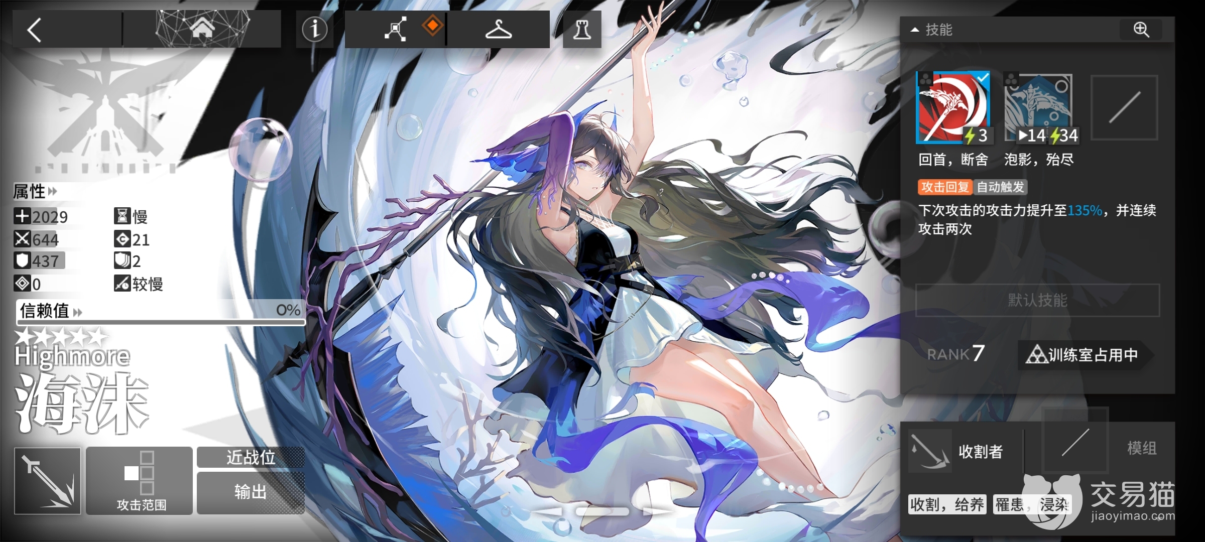 要了解海沫,首先要了解海沫的特性,海沫是近卫中的收割者,收割者这个职业是明日方舟中极为稀少的存在,直到海沫的出现,收割者也一共才有羽毛笔和海沫两位。