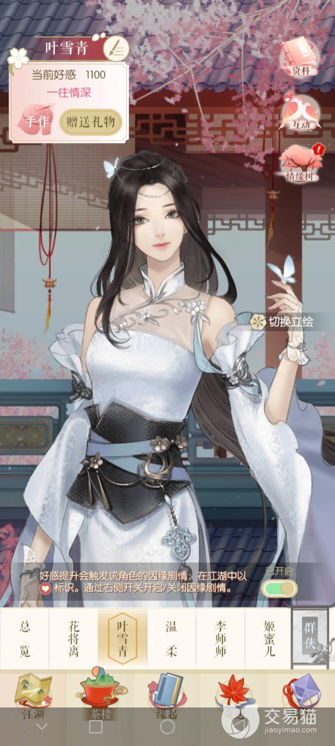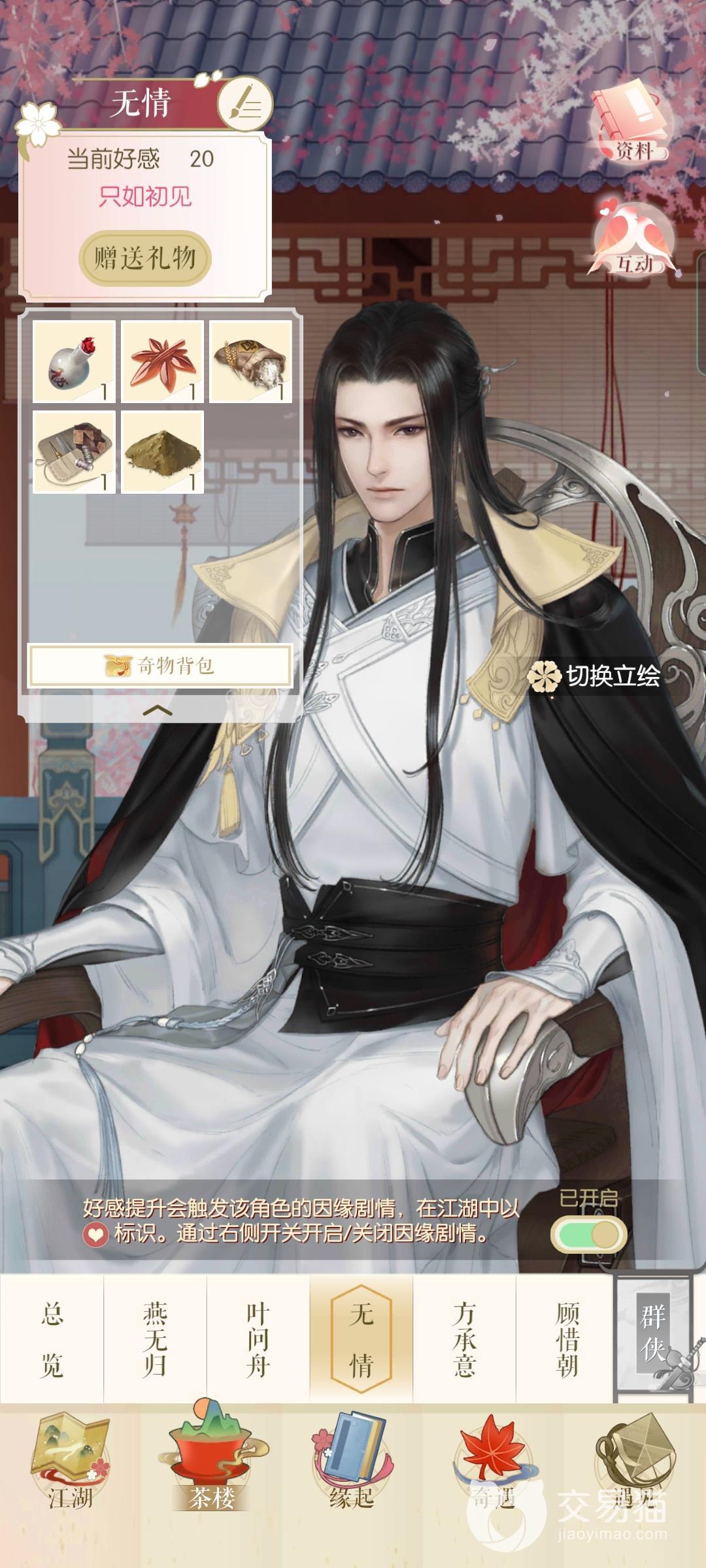 初始获取一个角色是不能在茶楼内与其交互的,但是达到一定的好感等级就可以点击屏幕预与其互谈话,每天会有固定的限制次数可以额外提升好感度,达到一定等级之后只能通过赠送特定的礼物来提升。