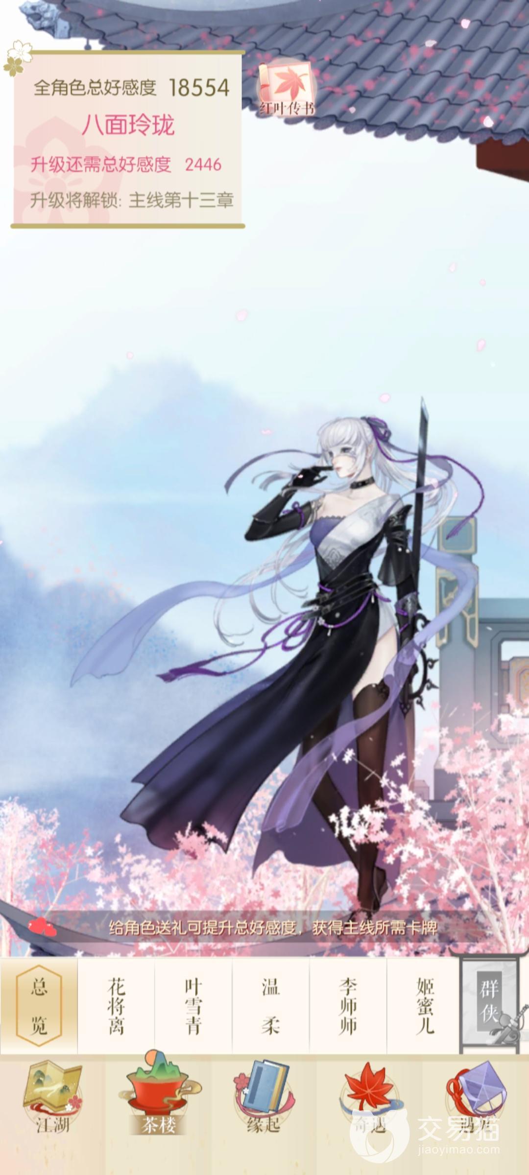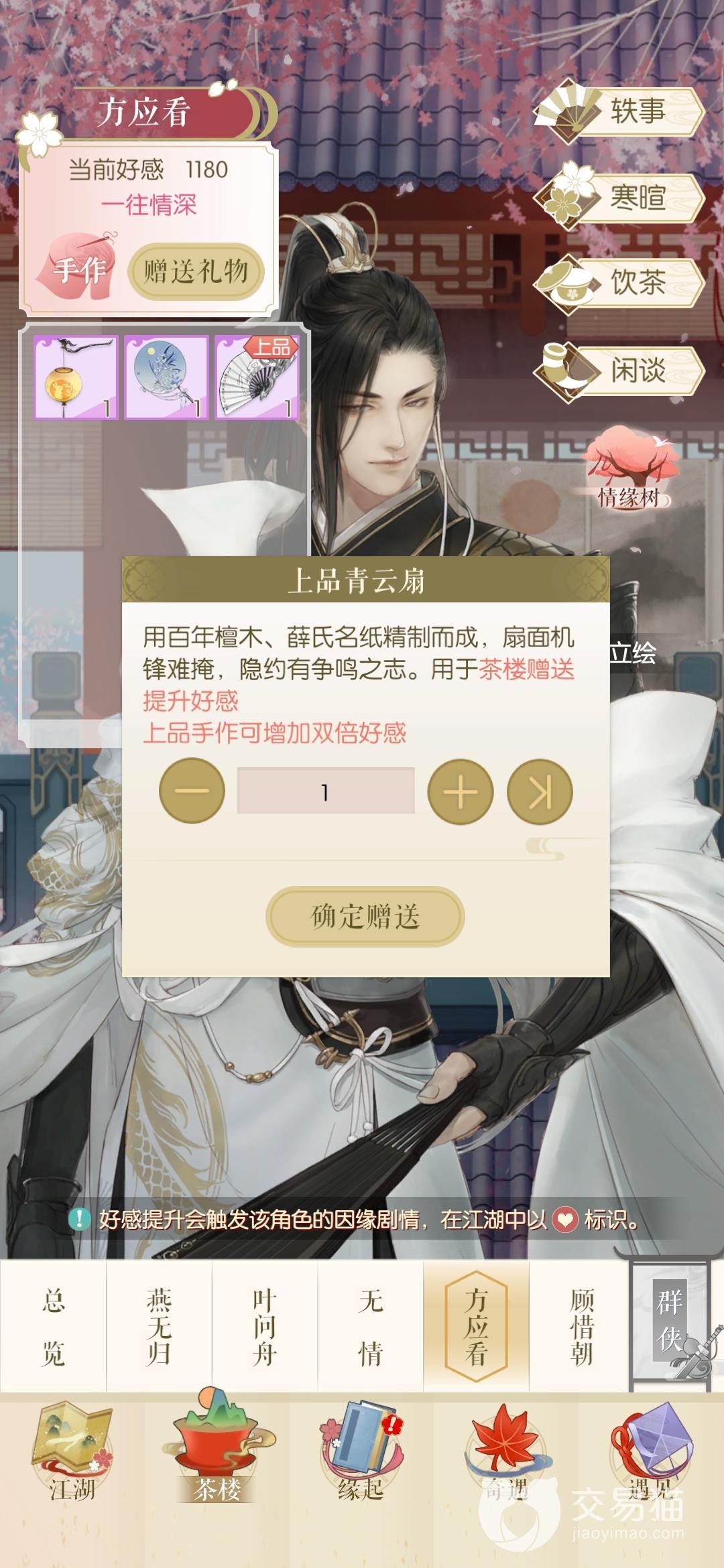 游戏内茶楼玩法的设定就是让各位玩家提高10位角色的好感度,总共可以分为12个等级,可以赠送的礼物大大小小可以分为将近两百多种,但是根据每个角色的不同喜好,赠送茶楼道具所获取的好感度收益是不同的,具体大家可以查看交易猫攻略专区的礼物角色礼物赠送攻略。