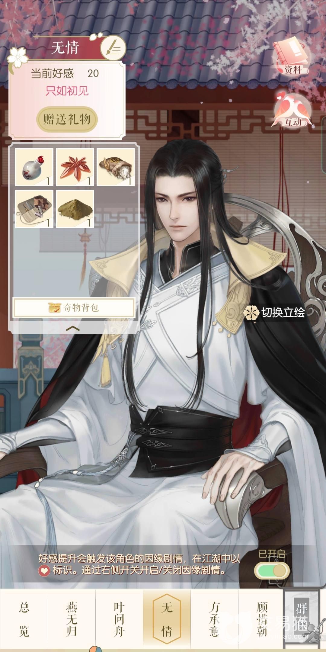 游戏内选择男线的玩家 没有必要纠结追风翼和蓑衣的种类差别,提高的好感度是相同的,游戏内送给男角色的奇物可以通过限时剧情以及抽卡活动中获取,五大男角色提升最高好感度的奇物对应如下:方应看-玉红叶,无情-冰糖糕,叶问舟-柳笛,燕无归-薄荷,顾惜朝-宣州紫豪笔。