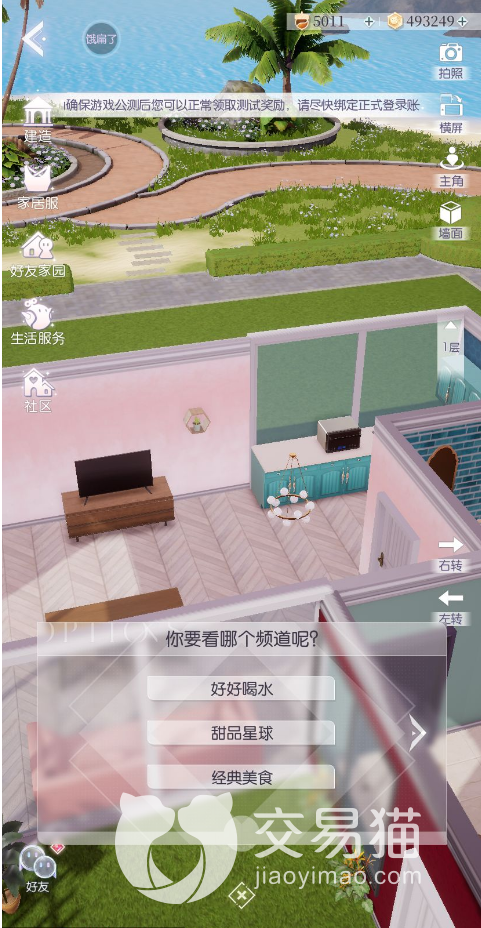 依然在建造中选择各个区域,此处选择娱乐区,在娱乐区中包括多种道具,选择电视,此处需要选择高级一些的电视,可以看到更多的菜谱学习。比如选择投影幕布,摆放方式是贴墙,选择墙面摆放成功后,即可选择电视频道,包含好好喝水,甜品星球,经典美食等,好好喝水是学习饮料,甜品星球是学习甜品,经典美食和特约播出是学习主菜品。当开始学习后,头上会出现紫色的灯泡,学习一段时间后,即可领悟做菜。