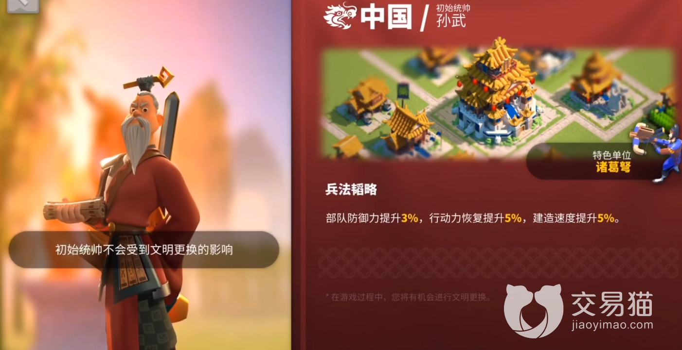 开局的文明推荐选中国文明,寻中国文明能够直接拿到强力的武将孙武,到后期的时候再更换文明骑兵,选择德国,步兵就选择罗马,根据自己的需求来选,建筑无法自主升级,在培训的时候需要留意时间的分配,高效率的进行升级。