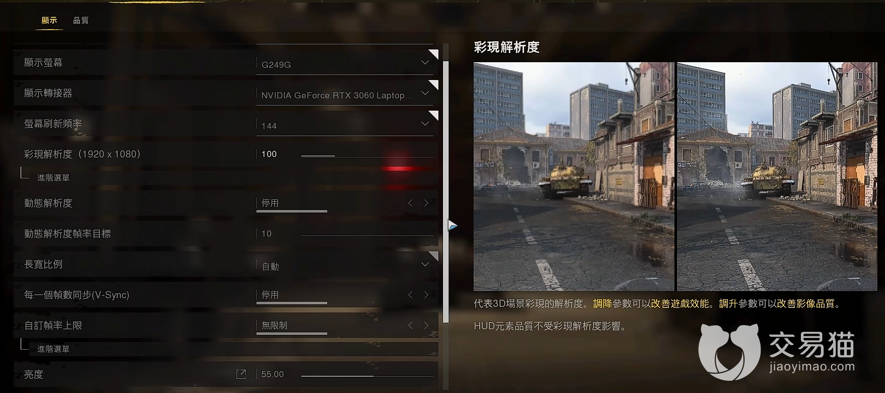 解析度和材质方面,建议拉到中等就可以了。有的时候高解析度和中解析度没什么区别,在高速对战的环境下,一般不会注意这些细节,感觉舒服就行。