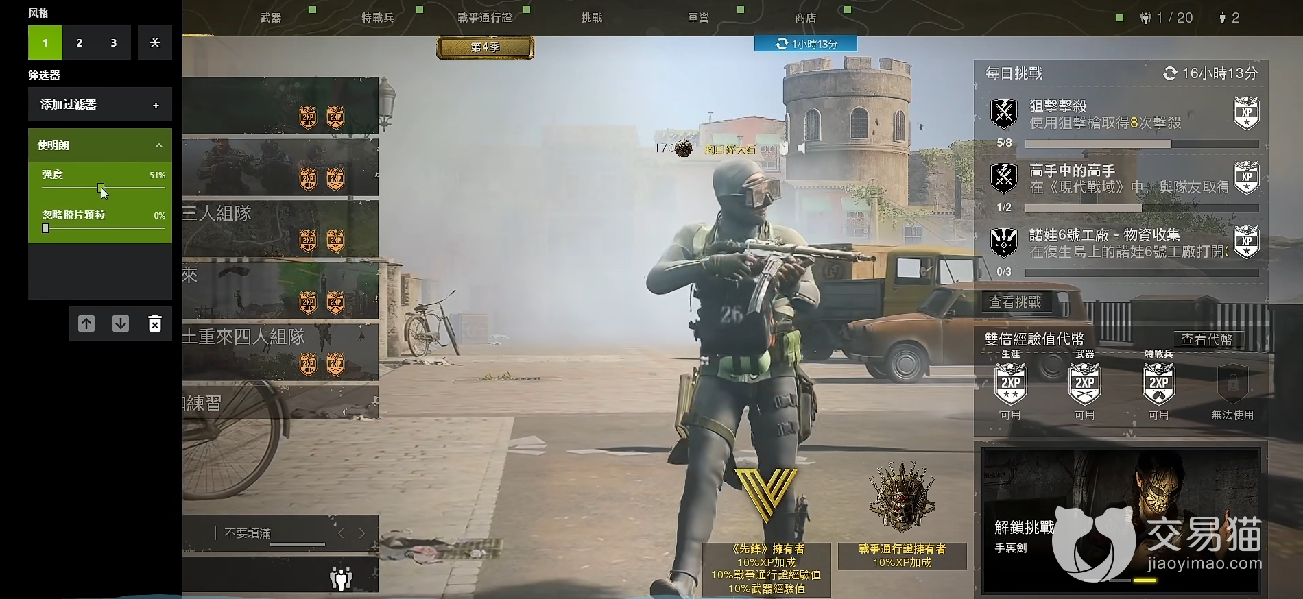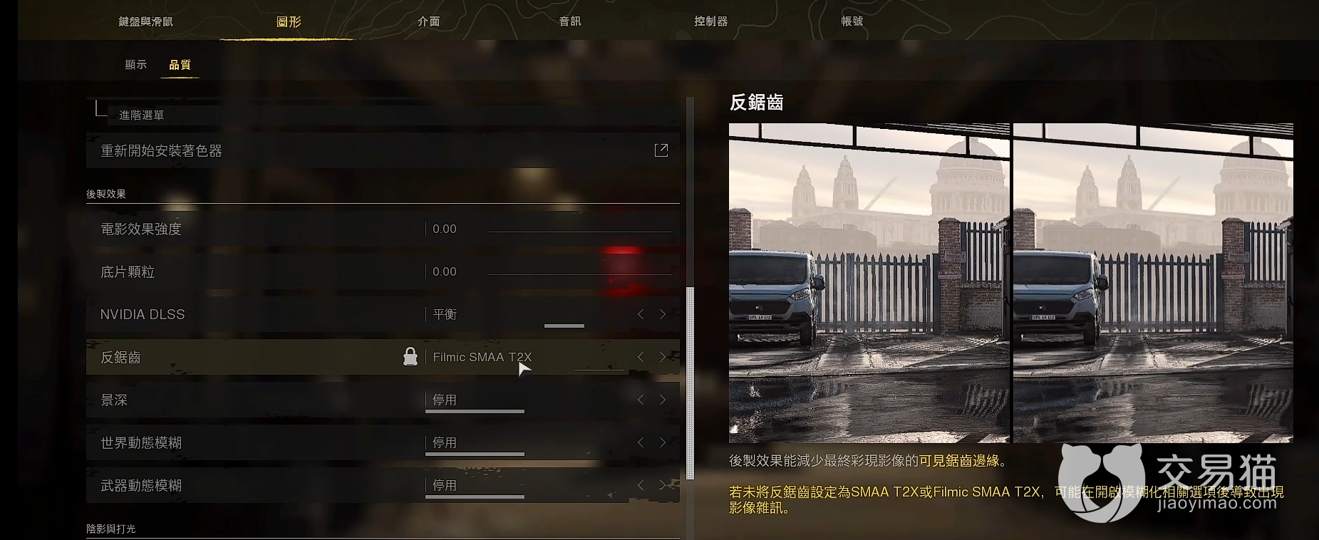 还有抗锯齿的选项一定要开启,不然游戏的一些物体的白边很不好看,有时近距离交火中很晃眼。游戏中的画面模糊是一个要点,还不行的话,用n卡的话建议加上n卡上的使明朗滤镜。这样一来游戏的画面将会非常的清晰,不过a卡的话只能另辟蹊径了。