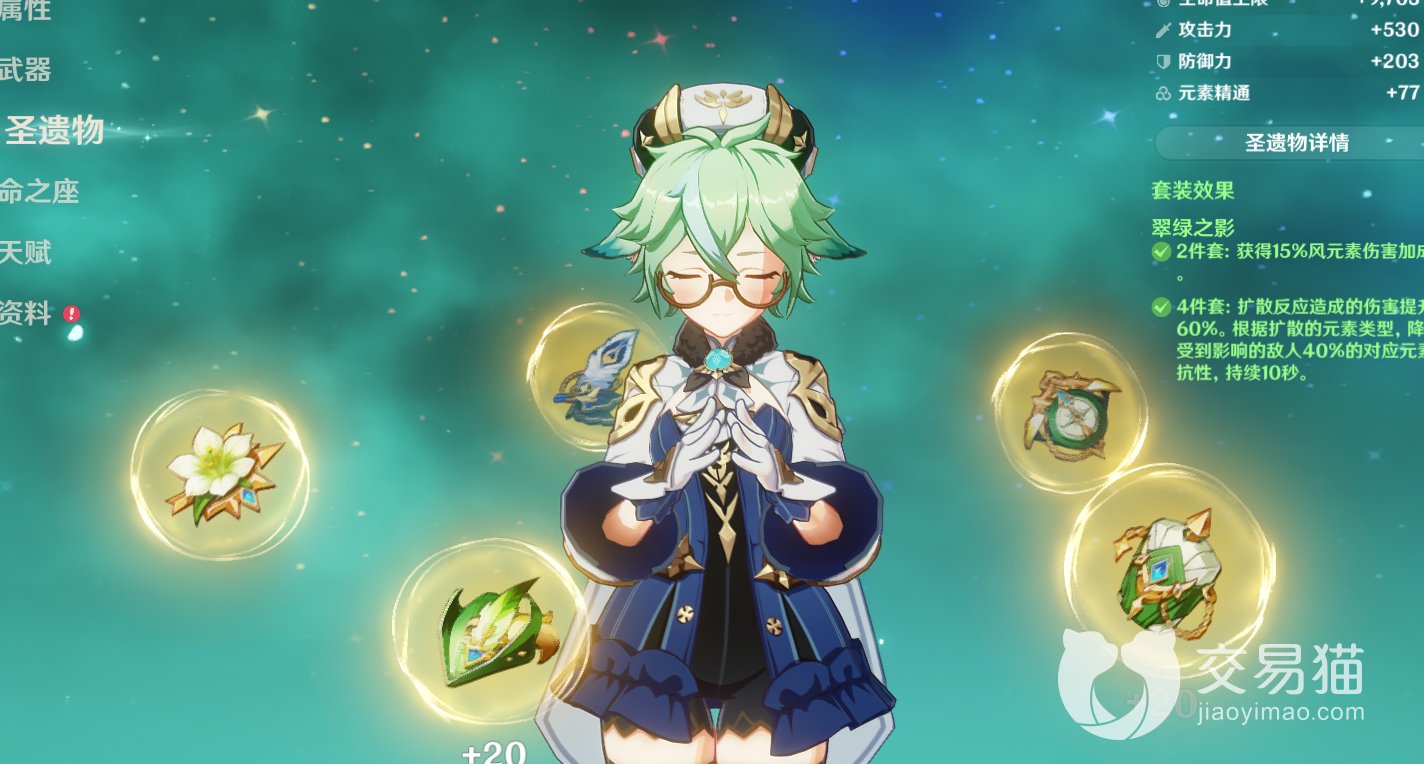 在套装方面,可以选择4【翠绿之影】,翠绿之影还是非常契合砂糖自身技能的。详细的套装加成可以在上图中看到。
