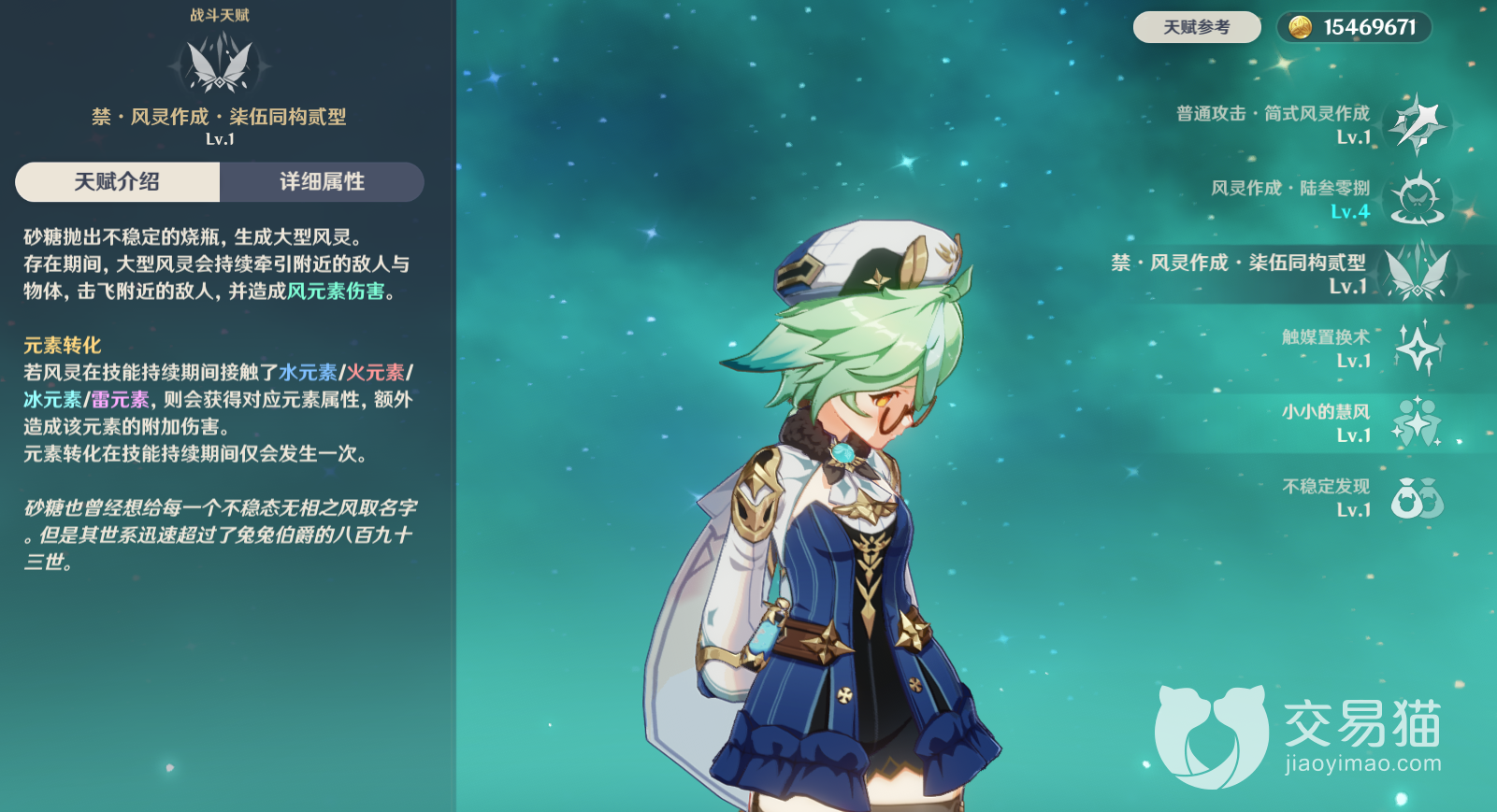 第一个固有天赋【触媒置换术】:在砂糖发生扩散反应进行染色之后,可以提升同属性扩散角色的元素精通。这个天赋是没有cd的,提升元素精通,就是提升大量元素反应伤害。