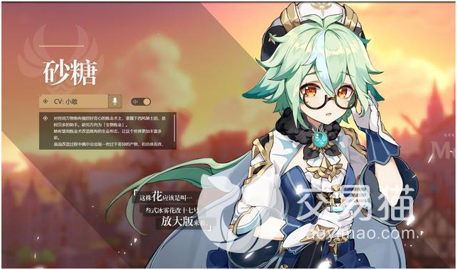 首先让小编介绍一下砂糖这个角色的基本信息吧!砂糖在游戏中是一位炼金术士,是风属性的辅助性角色。在游戏中,她容易害羞而且认真的性格可是吸引了非常多玩家的喜爱。她使用的武器类型为【法器】类,技能偏向于聚怪和辅助方向。