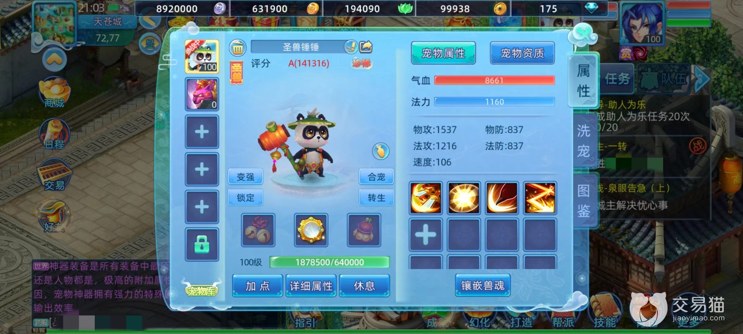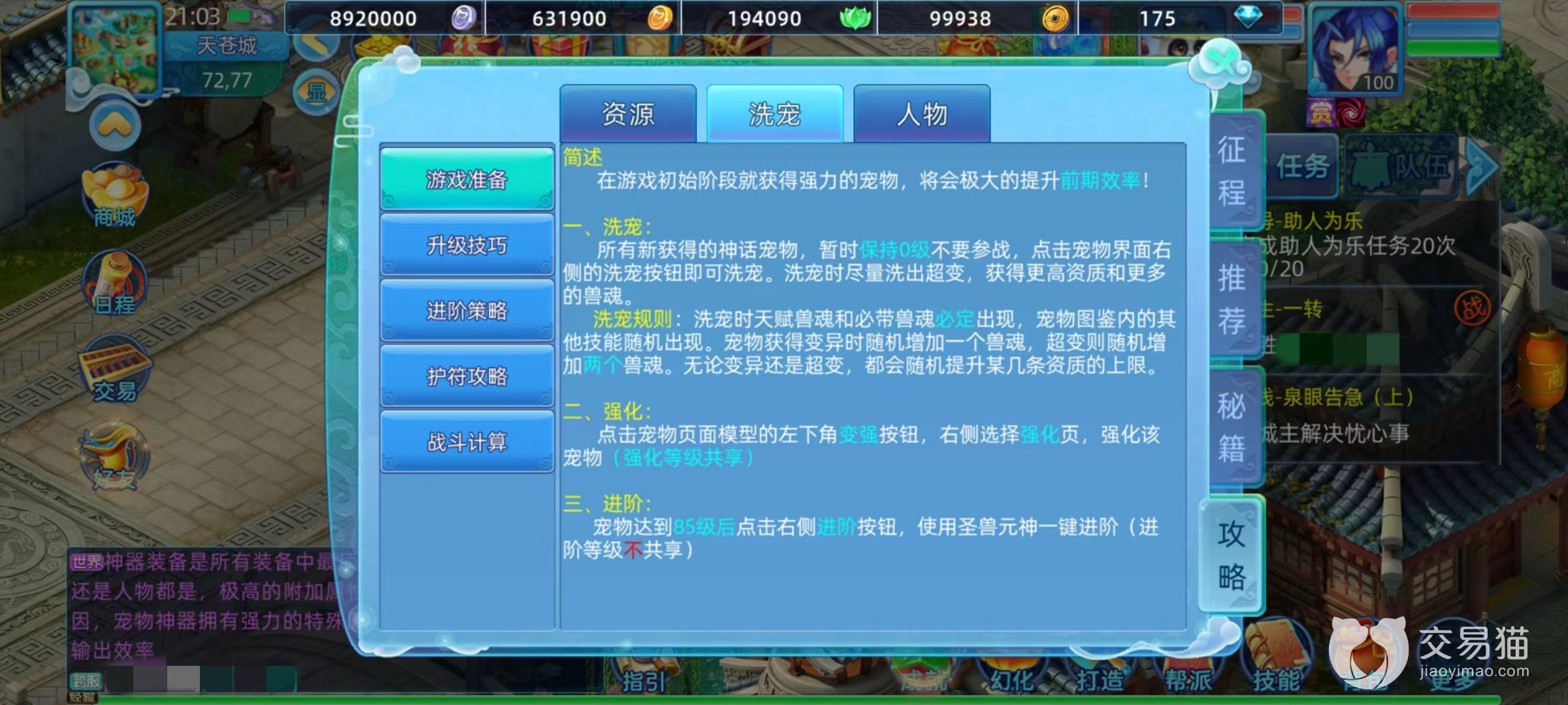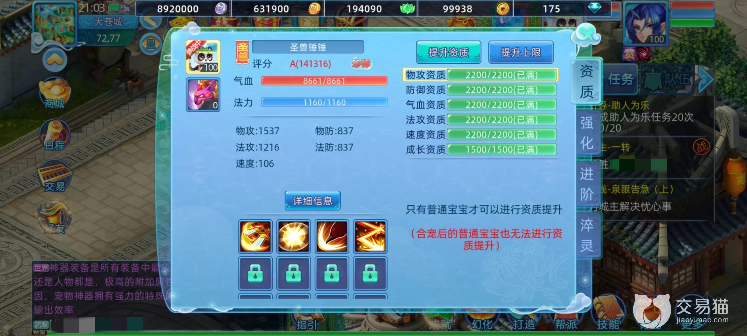 提升资质指的是当前宠物在洗宠后,依然有部分资质未达到最高属性,此时就可以通过消耗宠物资质丹的方式提升最大资质,一直到达到上限为止。接下来还能够对选中的圣兽进行一键强化,消耗的是宠物强化石,能够在杀星和速购商城等途径获取。