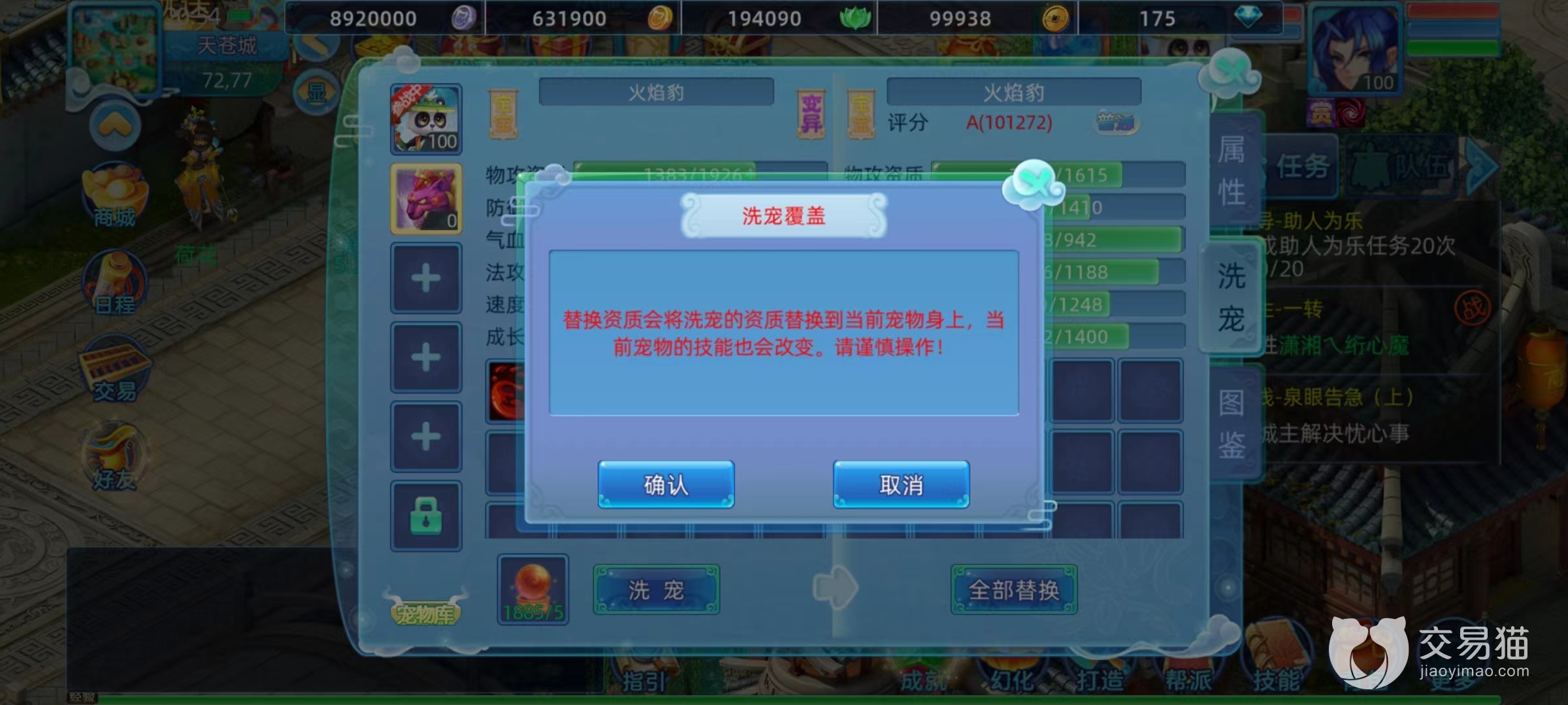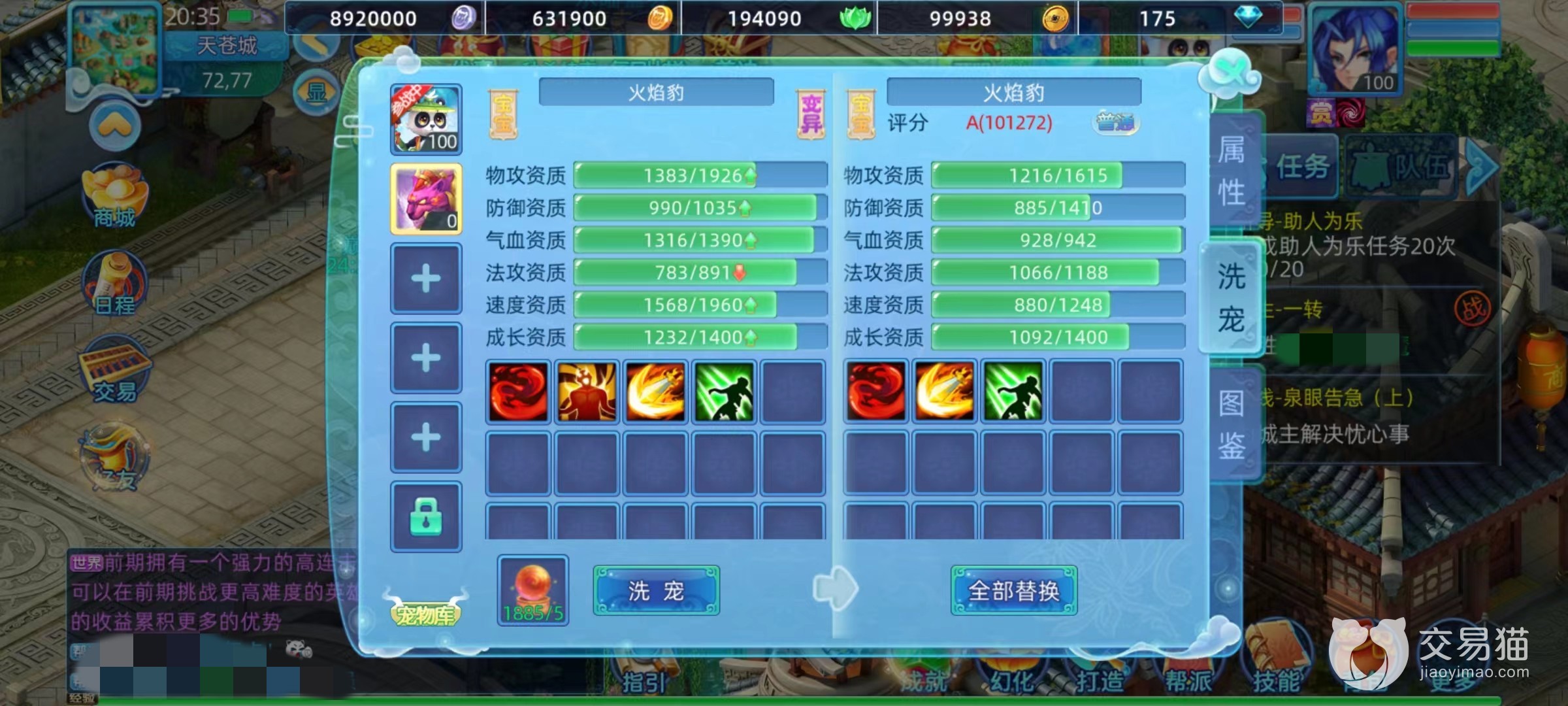 如果重置之后的属性和技能比较满意,就点击全部替换。当前的状态就被保留下来,后续还可以继续重复操作,一直到获得满意的效果为止。对于已经进行完变异操作的宠物,要想继续强化,还可以进行提升资质、合宠和转生,其中转生提升的是宠物的等级上限和人物的转生非常相似,只要达到100级就可以晋级到下一转。